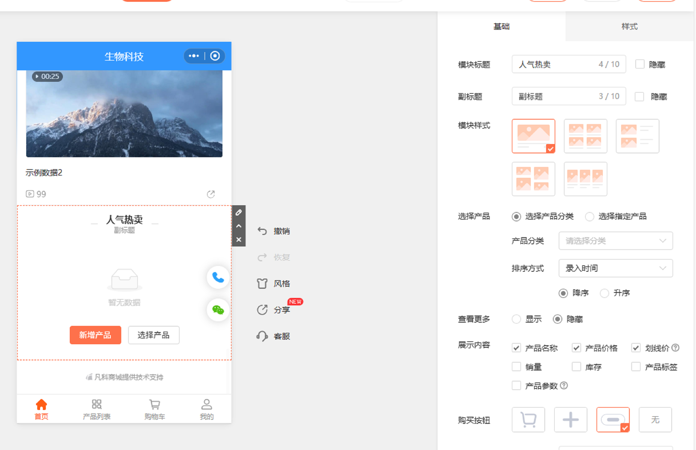 在设计页面,咱们可以对商城中的模板、控件、页面等进行设计欧。想在商城中更好地展示出产品的话,我们可以选择“产品展示”模块,对相关产品的价格、介绍、图片等进行编辑。