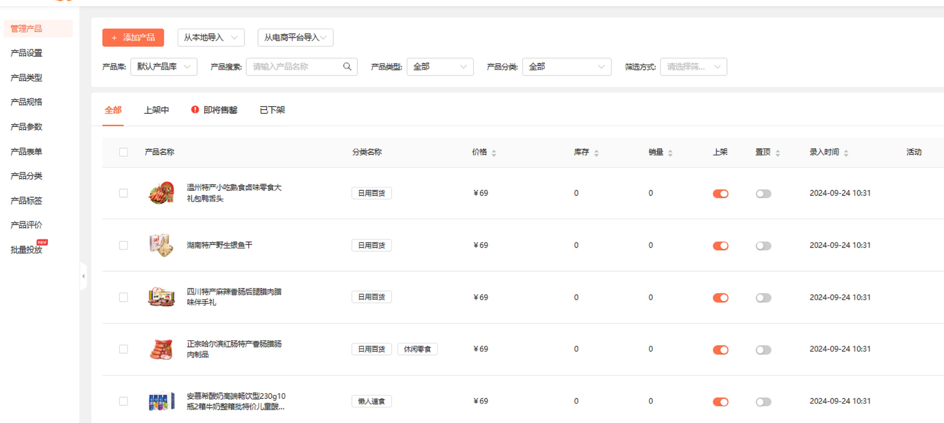 返回后台呢,你可以对商城的产品、订单、会员等内容进行统一设置与管理呀!比如说,在“产品”板块中,我们可以对商城中的产品进行上下架。同时,各个商品库存还剩多少是一目了然的,便于及时地进行补货。