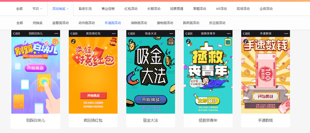 进入平台的模板中心后,选择“活动抽奖”中的“手速类游戏抽奖”,会出现一些相关的活动模板。每个模板所呈现的形式、风格、游戏都各不相同,大家根据活动的特点与主题来挑选就可以喽!