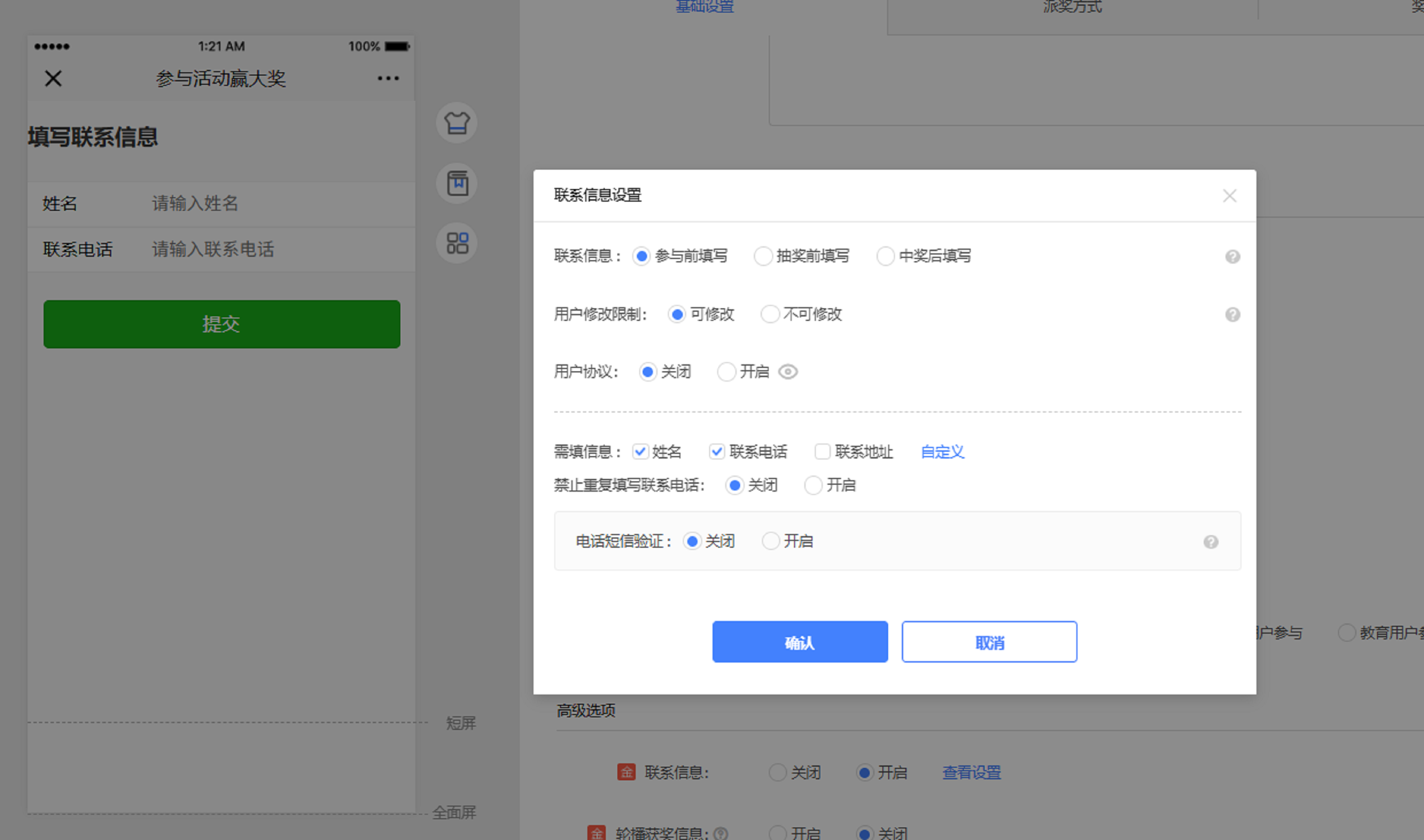 在这一板块,我们可以设置本次活动的名称啊、时间、参与条件等基本信息内容。如果你想进一步便于联系最终的获奖人,还可以设置相关的联系信息,如需填的信息内容、填写时间、用户修改次数等。
