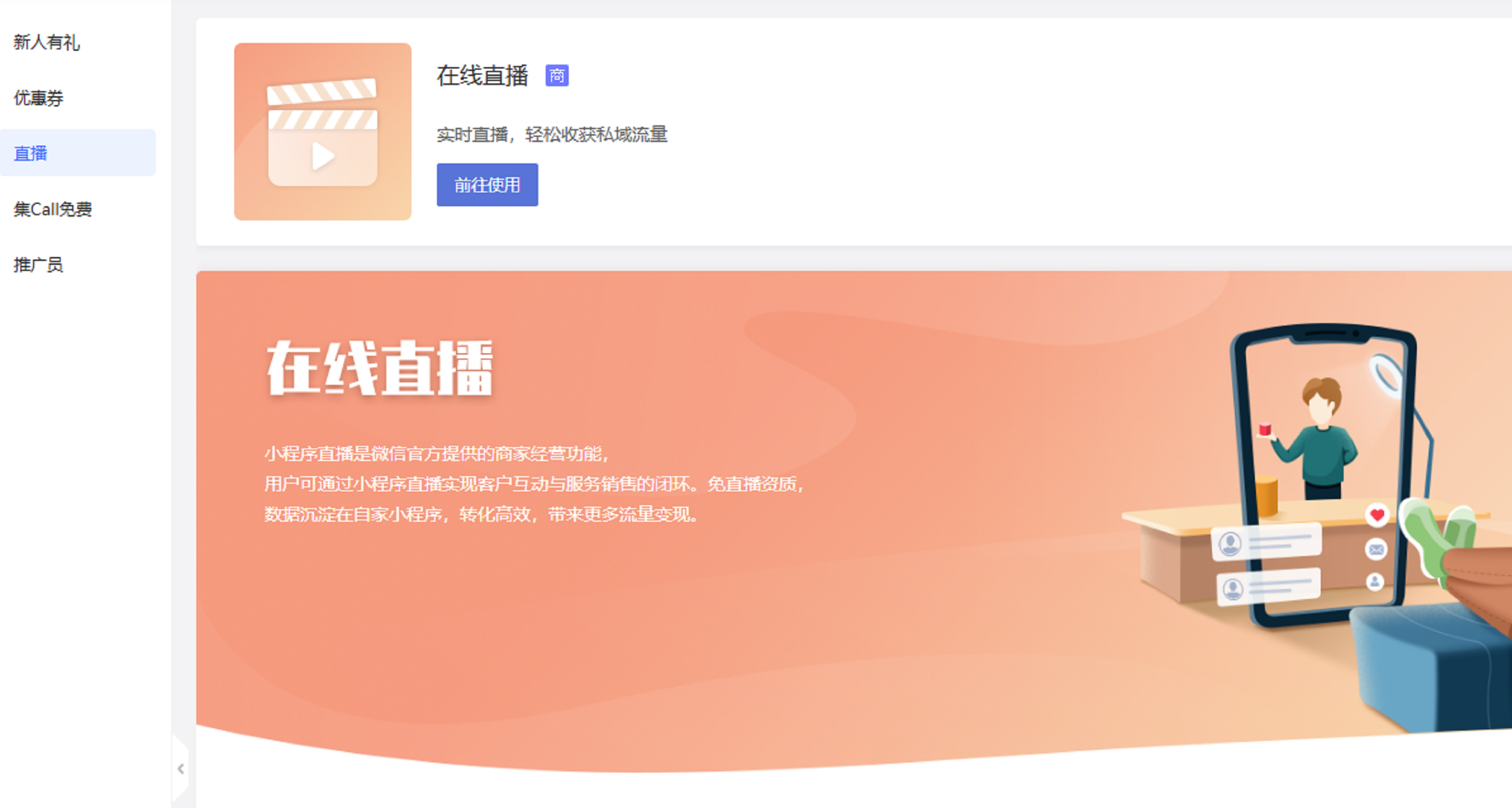 还有假如你有直播需求,你只需开启“在线直播”功能便可以轻松实现在小程序上直播喽。这不仅能够增强与用户间的互动,也带来了更多的流量变现呀!