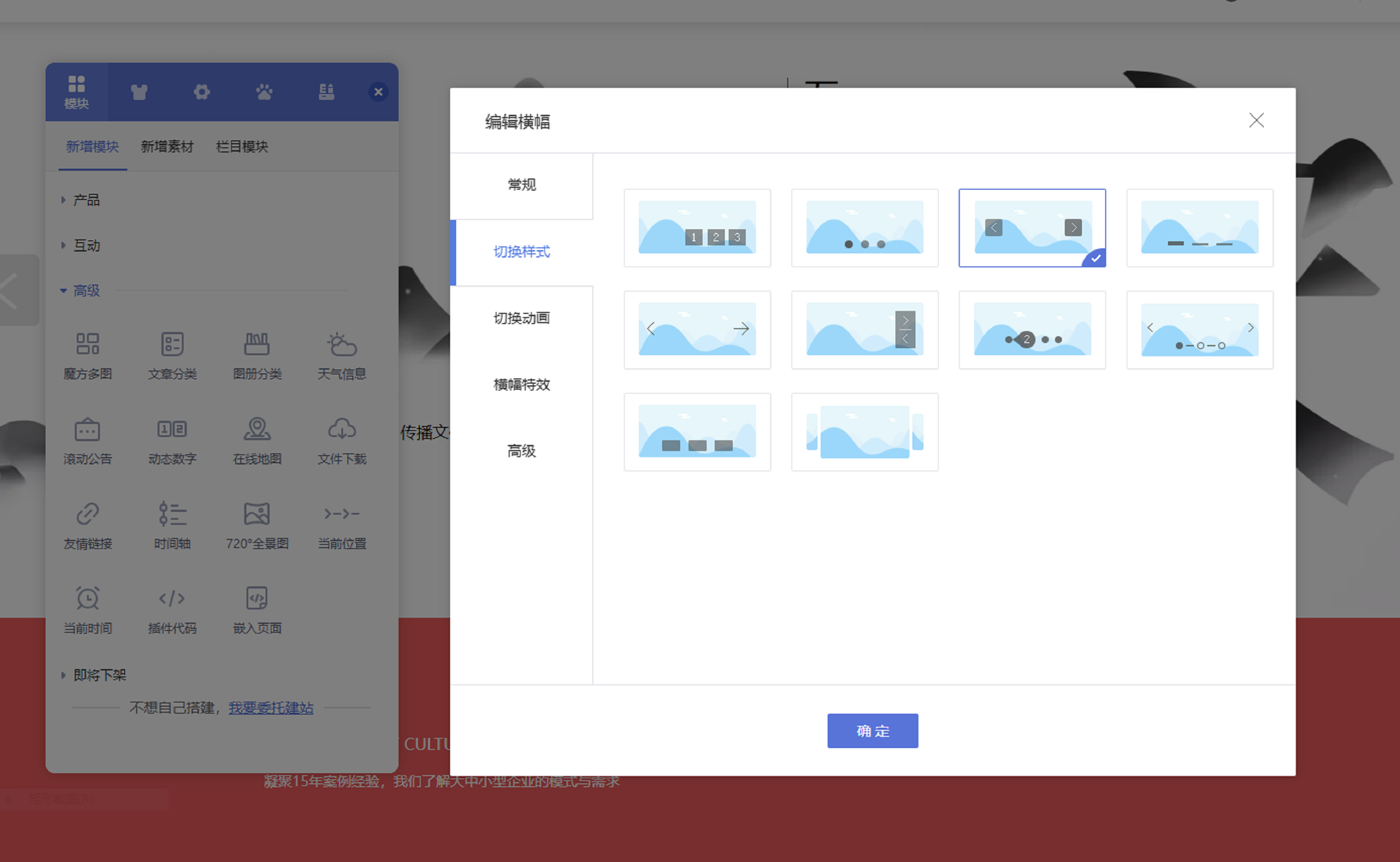 无论是网页的顶部还是底部区域,你可以直接点击相应位置便可以进行编辑啦~如果你不满意原本横幅的切换动画、特效、样式等等,咱们都是可以更改的。