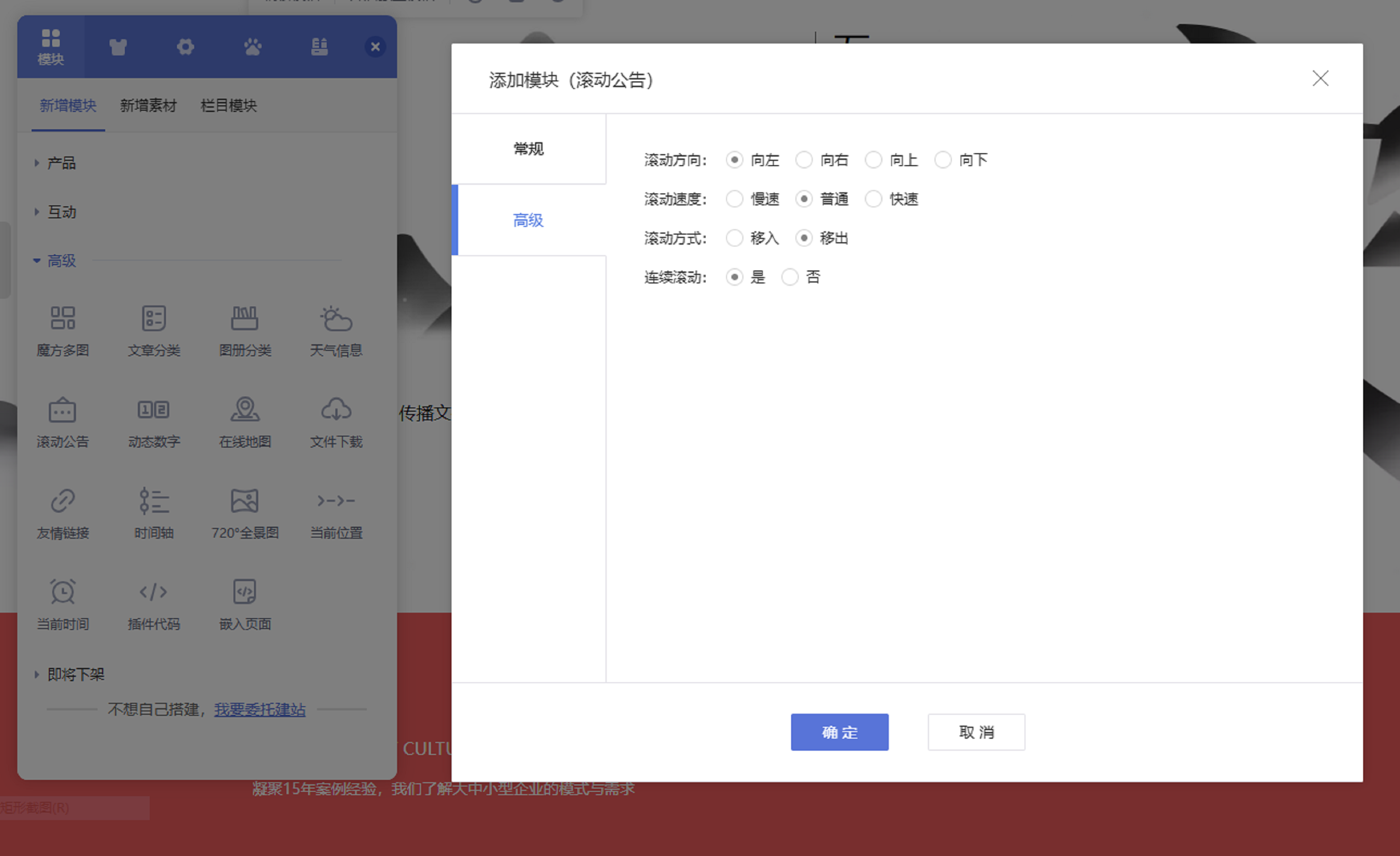 比方说,你家公司最近推出了一个新活动需要推广,那么“滚动公告”这一模板便很适合啦。除了可以添加公告内容外,你还可以设计公告滚动的方式、速度等等哇~