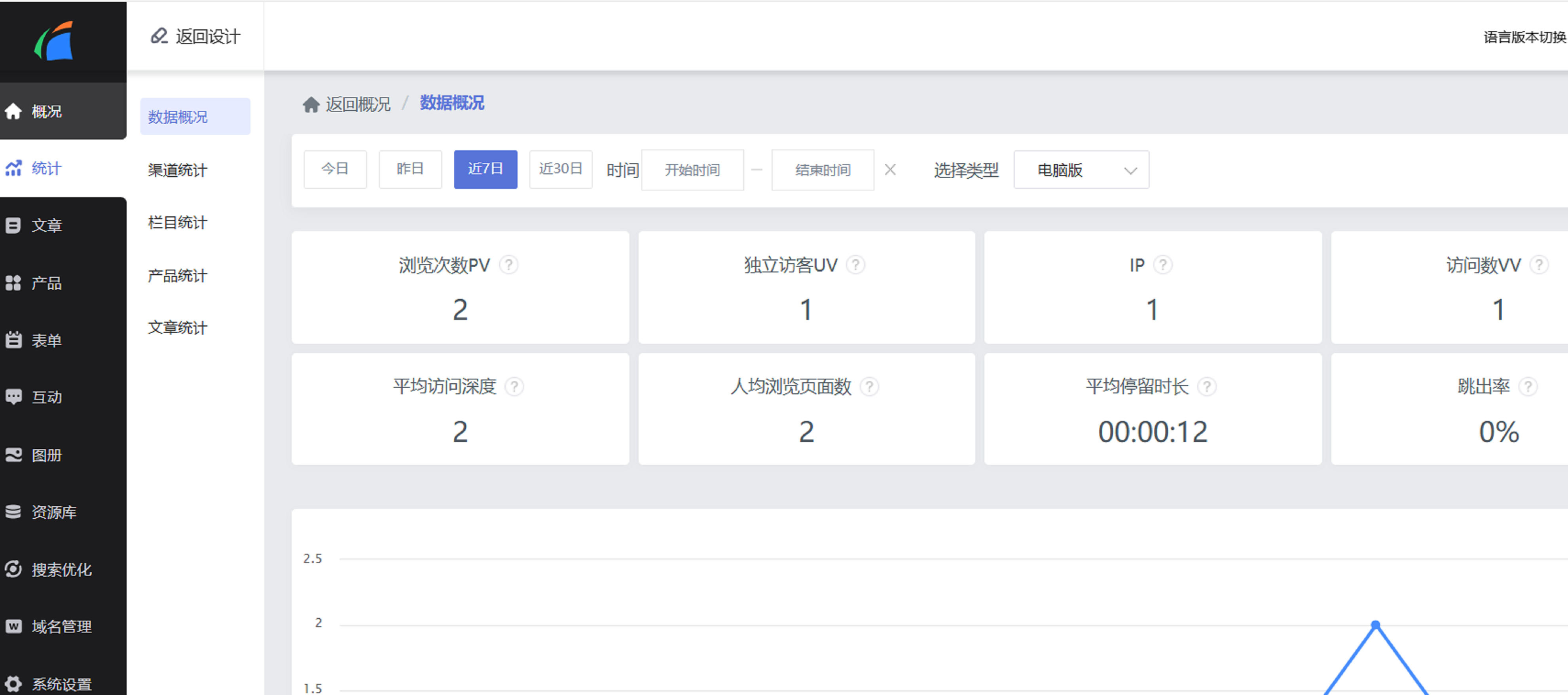 假如你想了解自家网站的访客量是怎么样的,在“统计”这里,我们可以清楚地看到PV、VV等详细的数据,便于后续进行统计与分析哇。