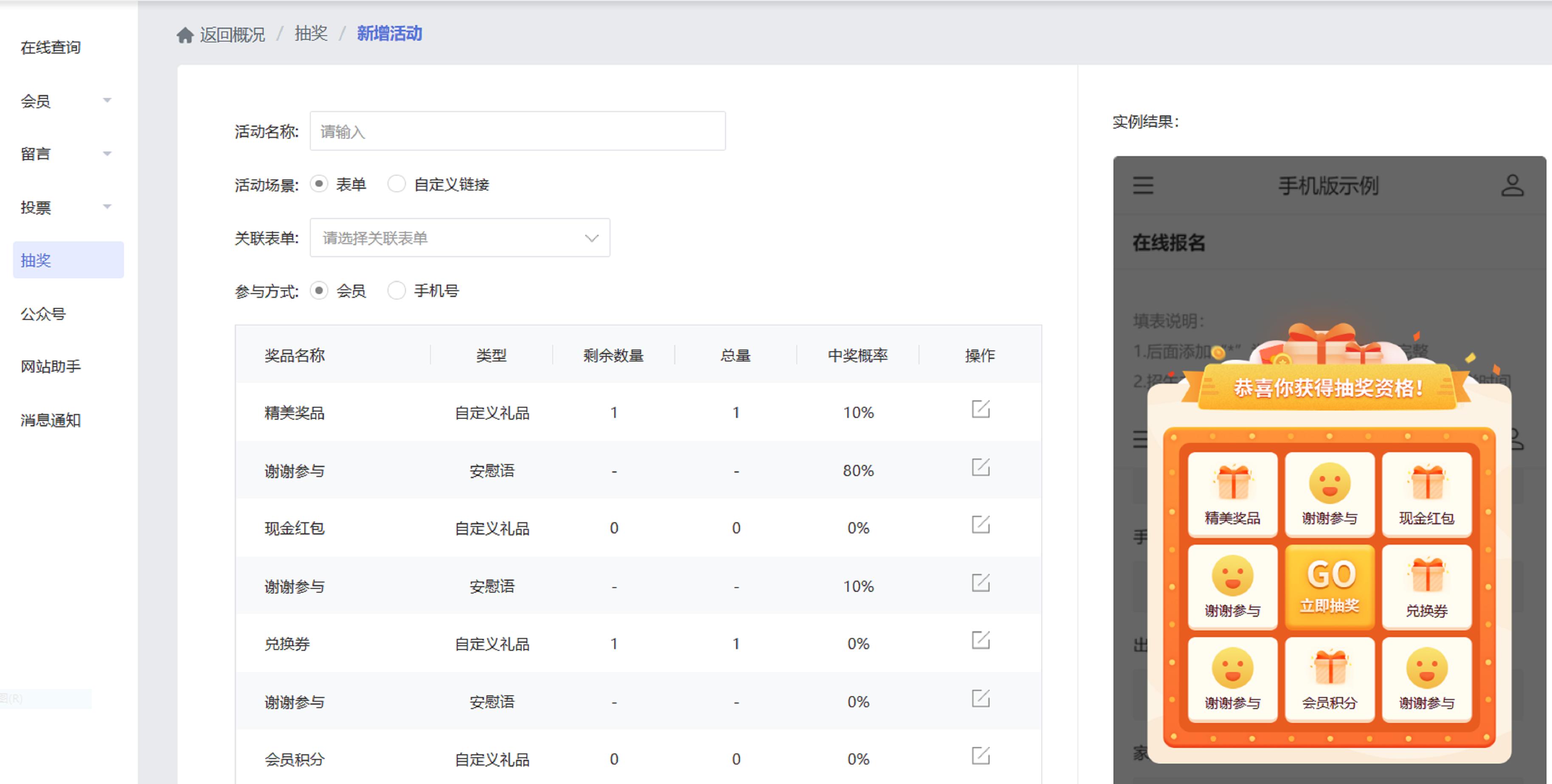 同时,你如果想通过网站来增加与用户之间的互动,那“抽奖”这个功能很合适欧~咱们通过设置抽奖活动相关信息,便可以吸引用户们积极参与啦,也助力你快速获取潜在客户联系方式!