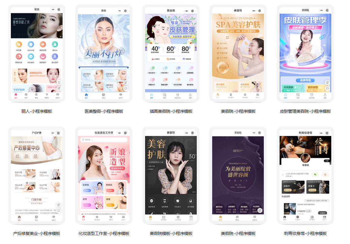 进入首页,我们选择“美业”后,再选择“美容院”,平台会呈现出许多适用于线上美容护肤店铺的模板。各位老板们根据自家店铺主打的服务与主推的产品来选择一个合适的门店模板就OK喽!