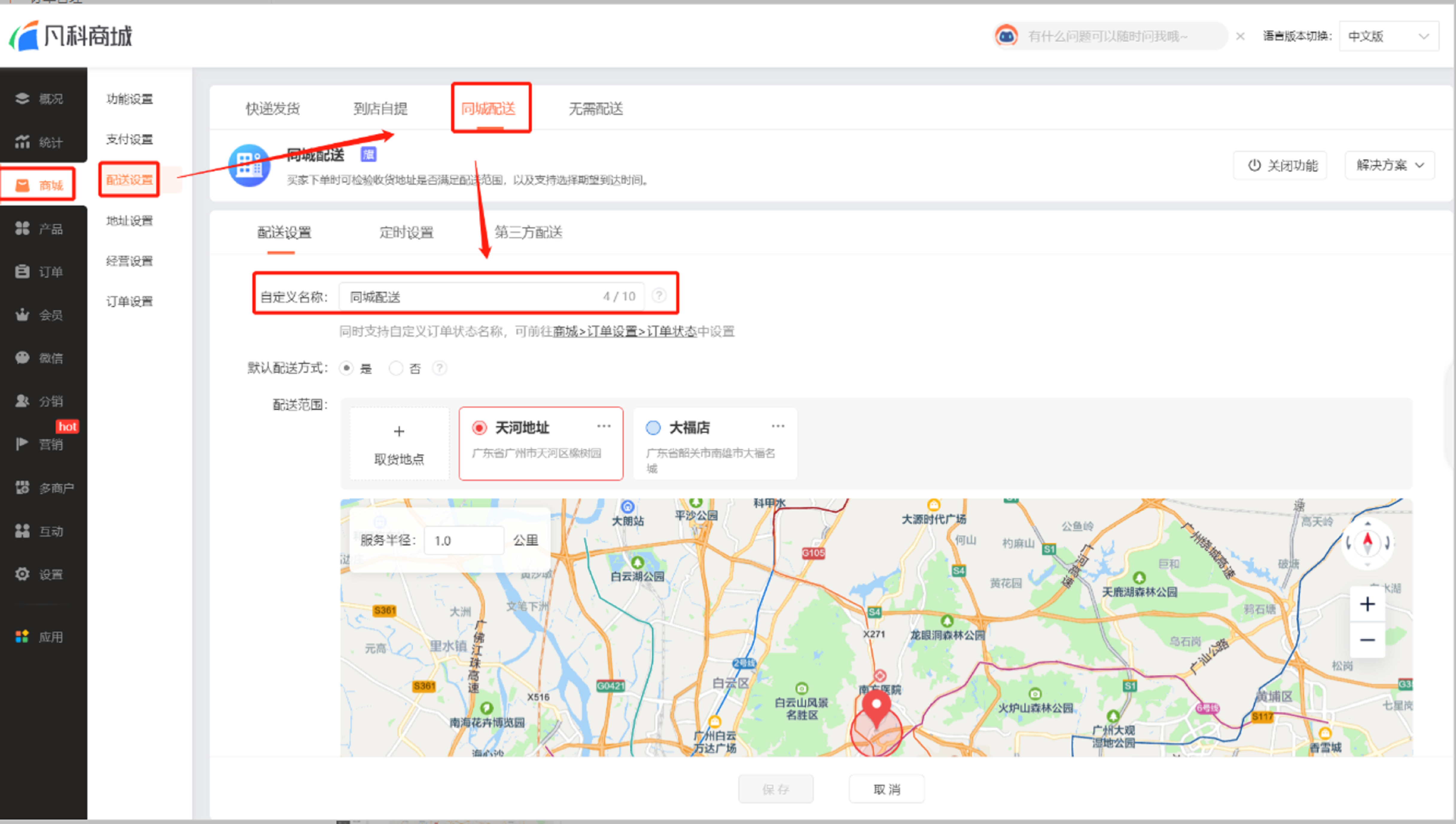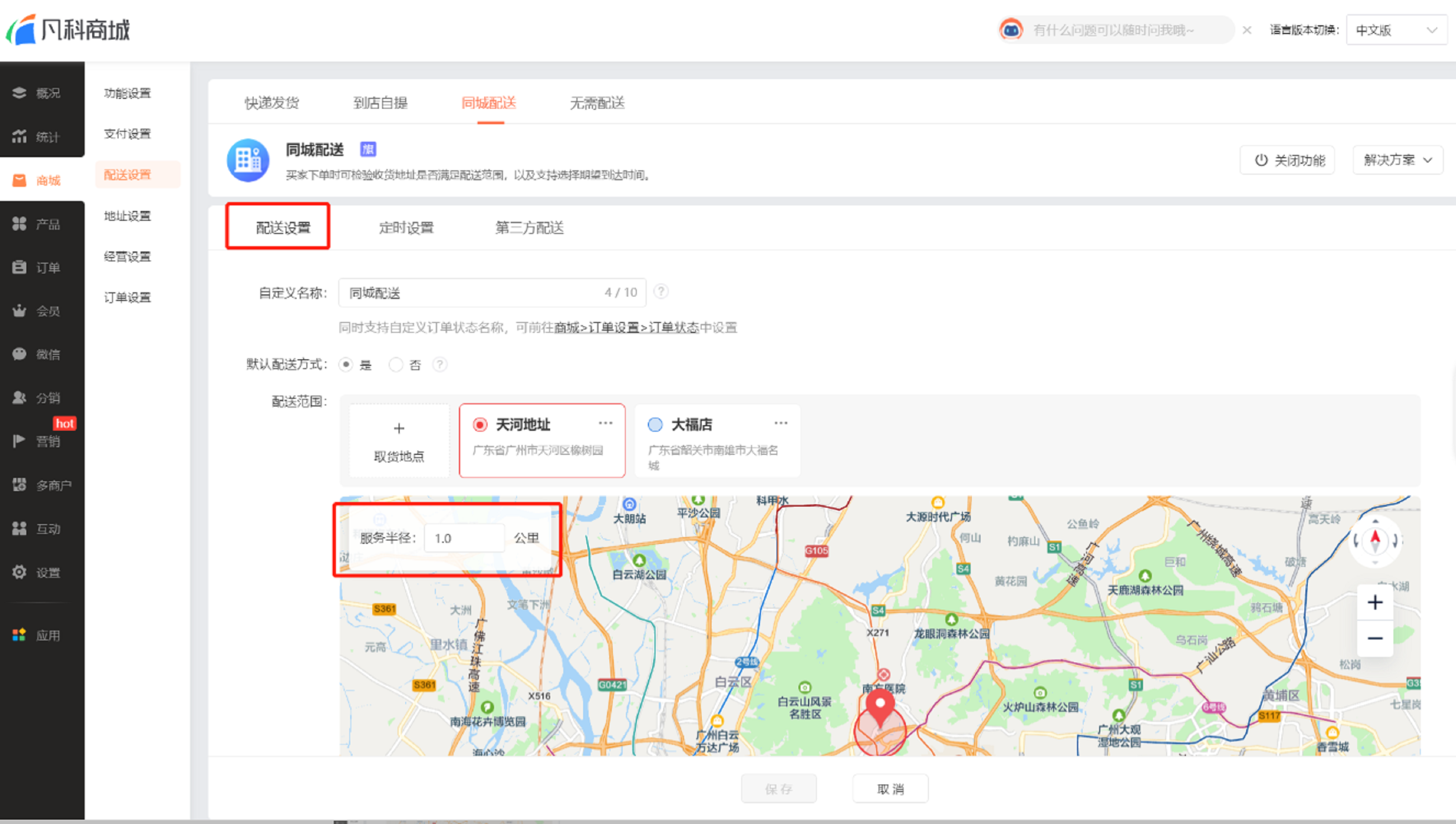 在平台后台上,选择“商城”菜单栏中的“配送设置”后,咱们选择“同城配送”,再点击“开启功能”便开始进行具体设置喽。