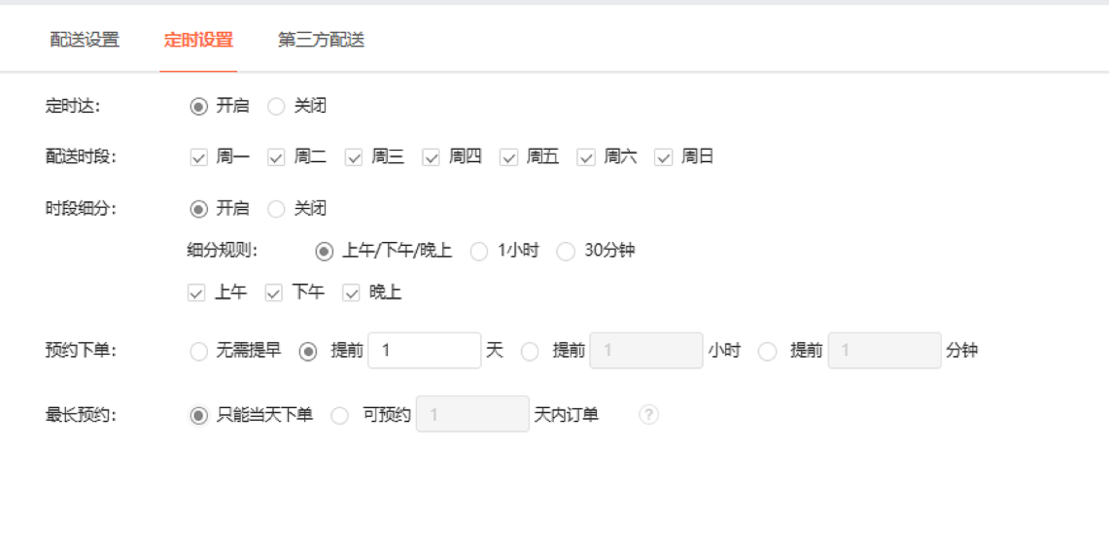 这一步主要是来选择咱们店铺的配送时段的。不仅可以选择那几天配送,更可以细分到上午、下午、晚上、30分钟、1小时。