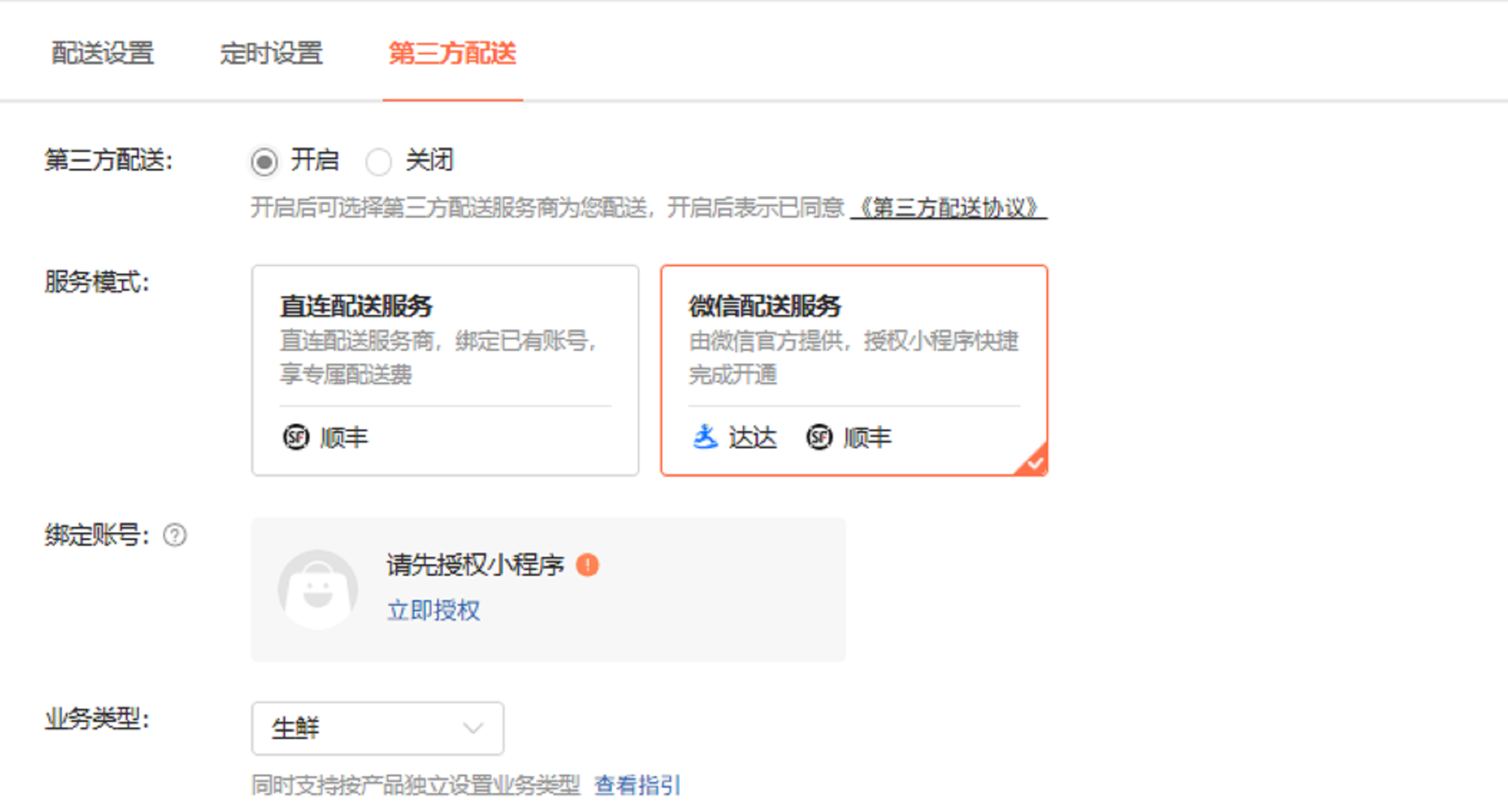 假如店铺的人手不够的话,咱们还能选择“第三方配送”。有两种服务方式可以选择,帮助你来更加高效地送货。
