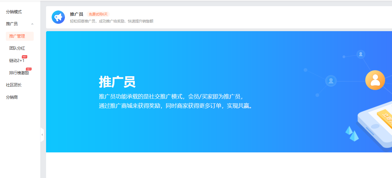 同时,如果你有分销需求,那在“分销”页面上你可以设置分销模式。平台提供了完整的分销体系,设有三大分销功能,能够帮助你家商城产品更好地售卖。