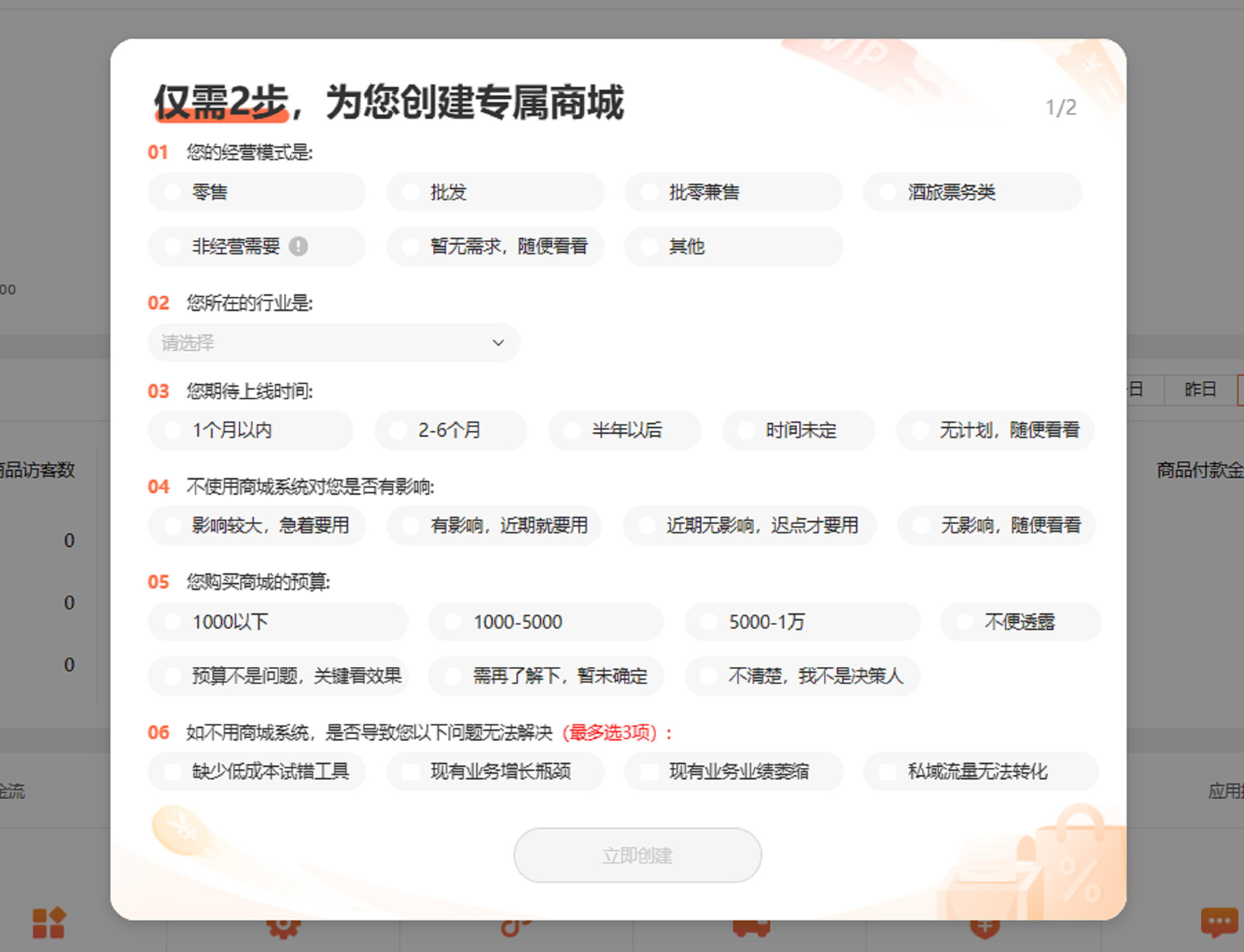 进入平台后,我们首先点击“创建商城”。这里会有些选项来让大家选择,目的是平台为了了解老板们的搭建需求与目的是什么。