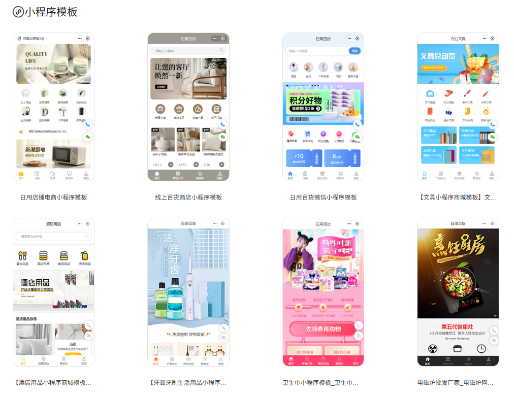 点击“小程序模板”,平台会为大家呈现出各个行业的模板类型。那咱们就选择自己所处行业,挑一款符合咱们商城风格的模板后就可以展示设计啦!