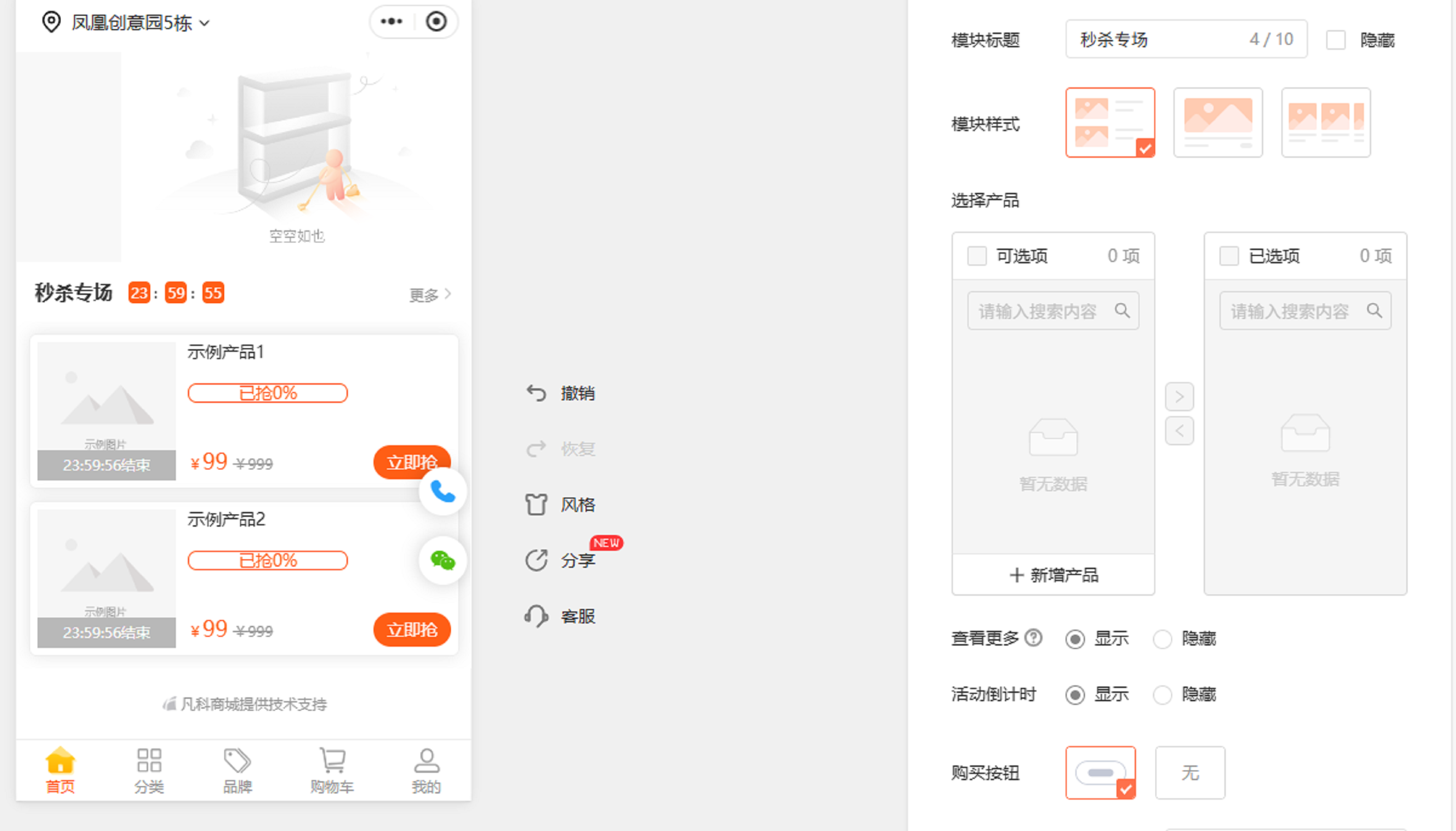 比如,你最近刚推出了秒杀活动,但参与的人数并不多。那么,你就可以通过添加“秒杀”模块来提升活动的曝光度啦。你可以添加上对应秒杀产品的图片、文字说明,也能改变其样式。