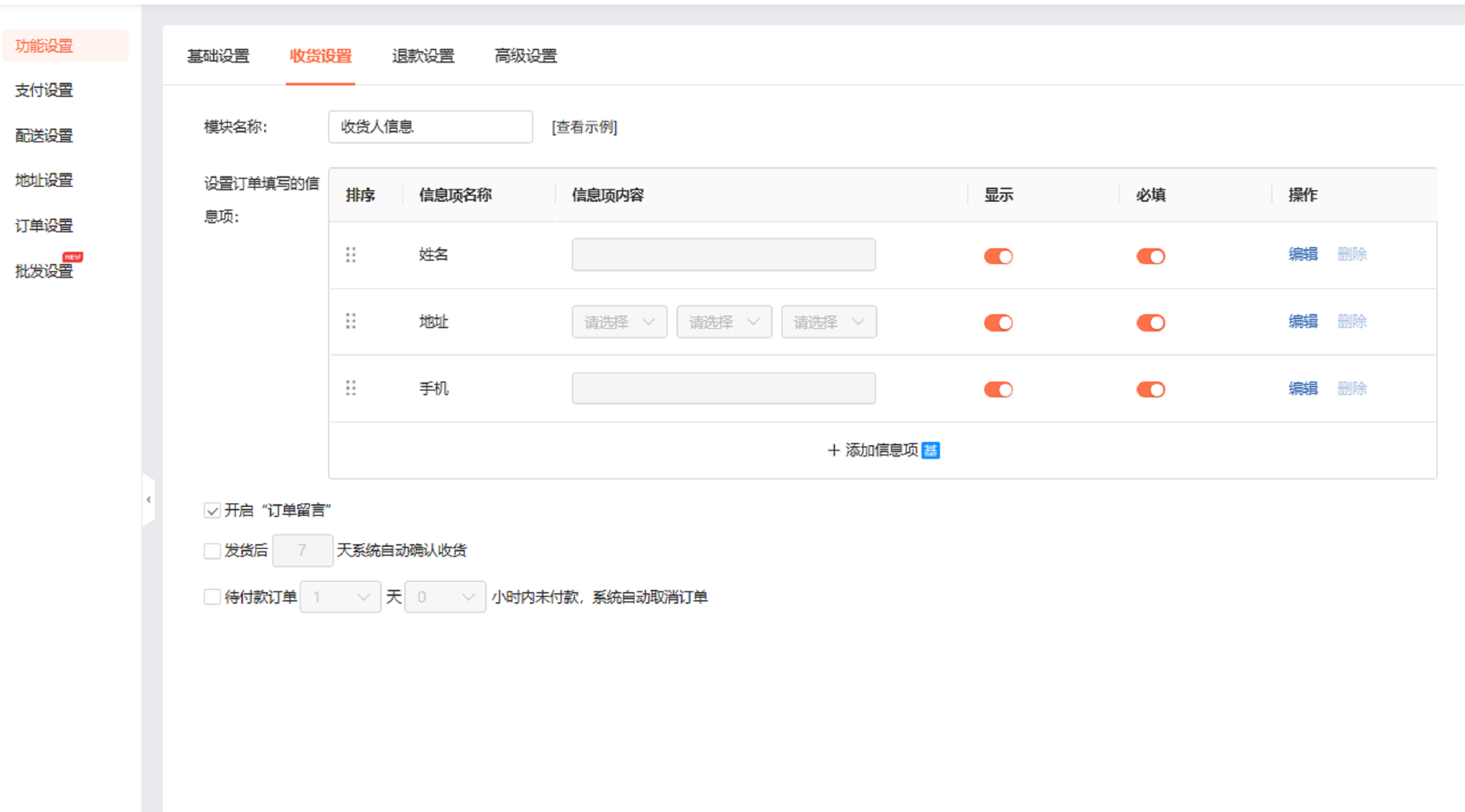 像是在“功能设置”页面,我们能对商城的收货、退款等进行设置欧~这样便能够确保收货、退款、支付等环节都可以顺利进展下去。
