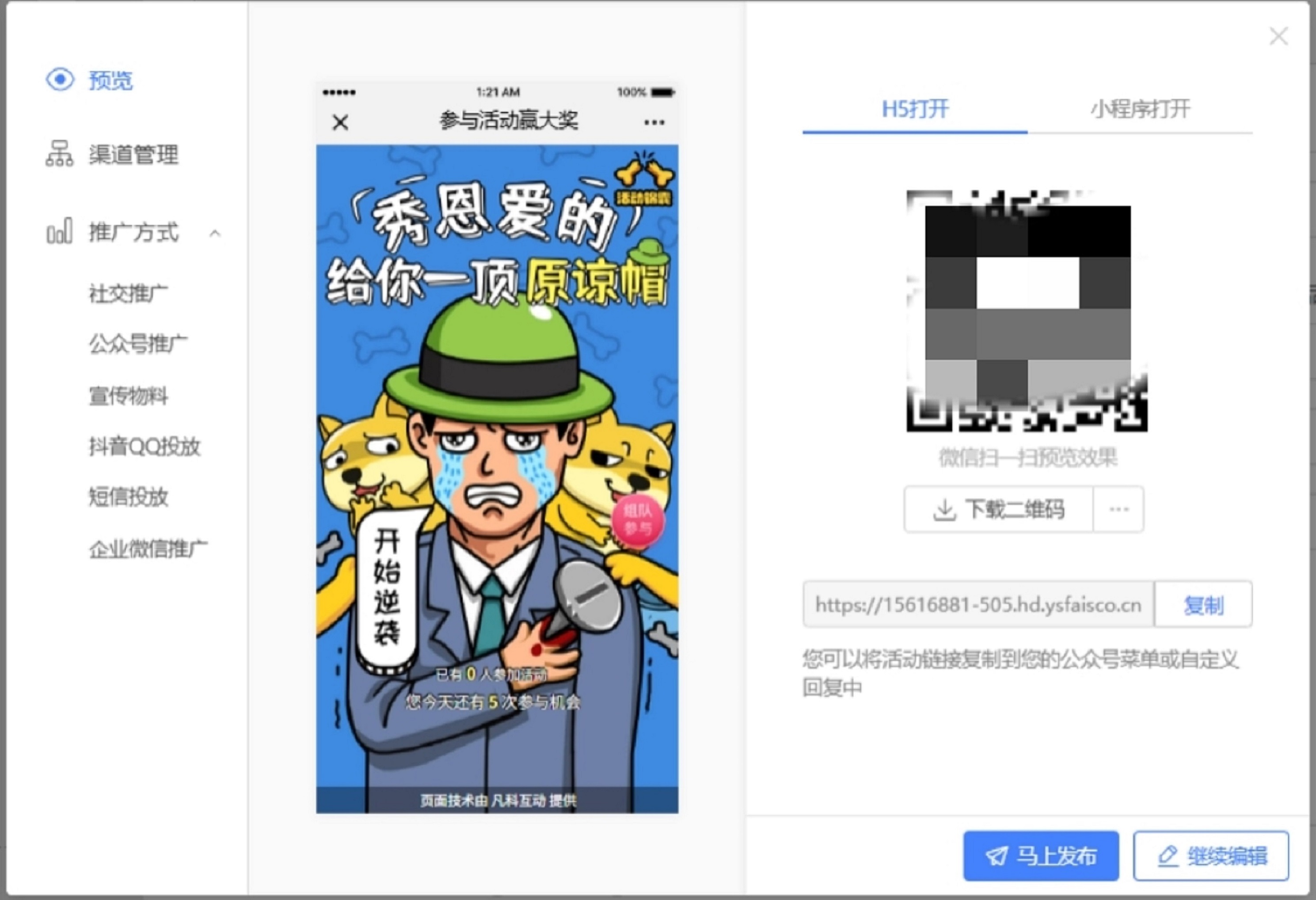 点击“预览与发布”,我们就能先看到活动呈现出的效果。而且,还有多种推广渠道可以选择。老板们选择利于自家店铺推广的方式就OK了。