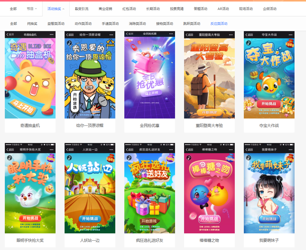 在平台首页,点击“活动抽奖”,咱们选择“反应类活动”后,便会看到许多不同风格和主题的反应类活动模板啦。每个模板都设置了不同的反应类小游戏。