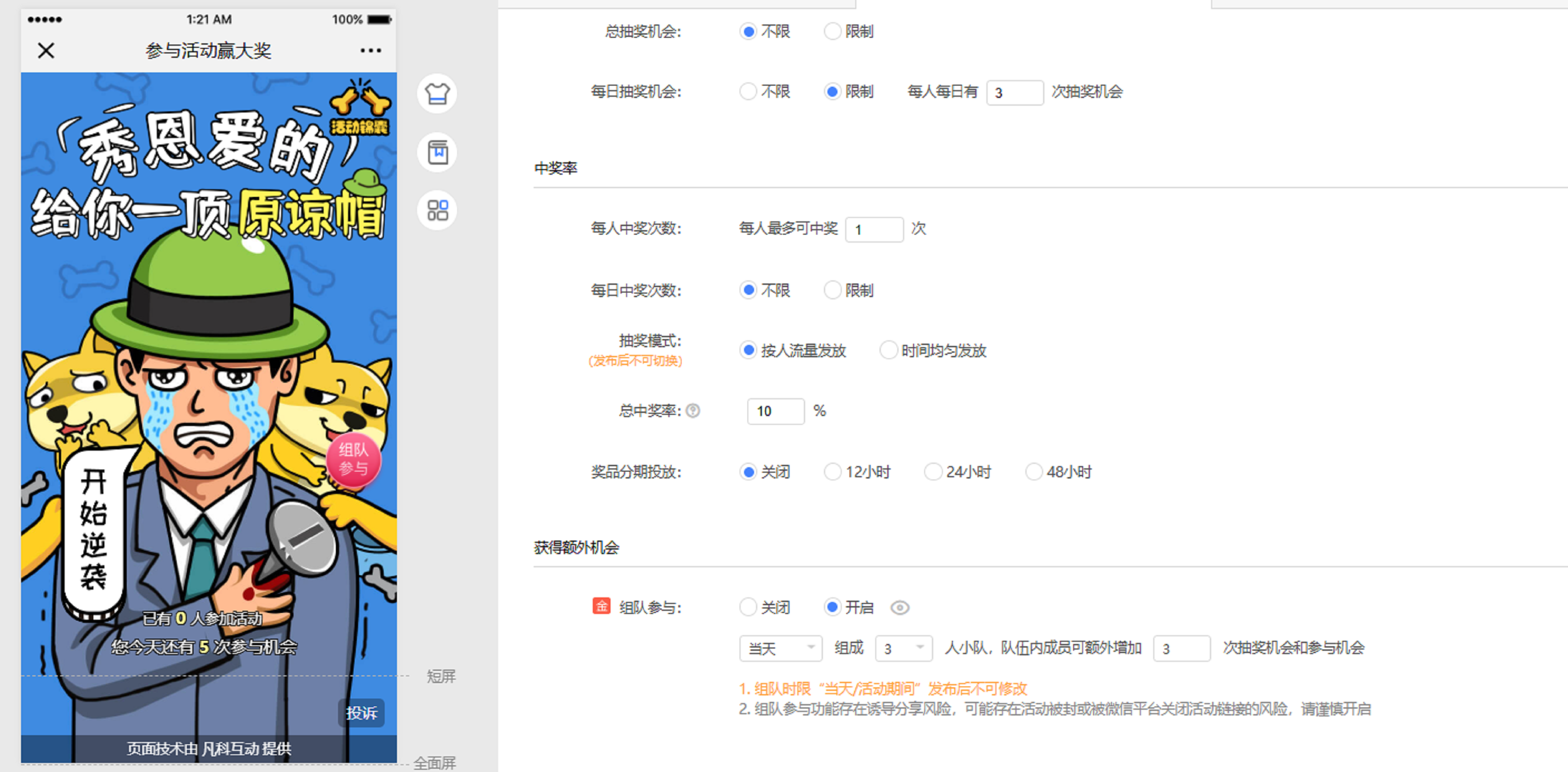 像是派奖方式,你需要对抽奖限制与中奖率进行设置。当然你还可以增加额外的获奖机会。只需开启“获得额外机会”便可以啦。