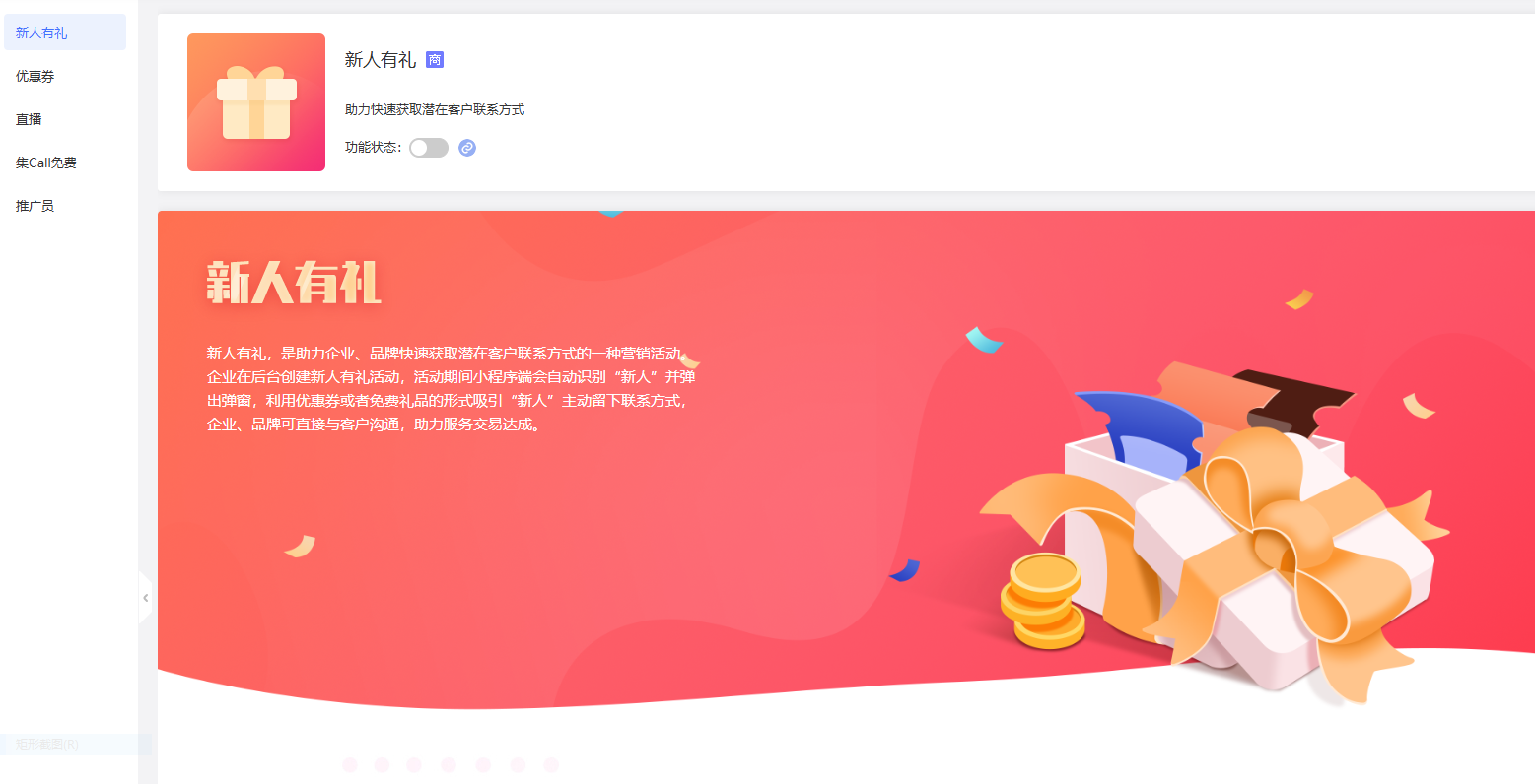 在后台,你可以实现对多端小程序进行统一管理,对公司提供的服务进行管理。假如你不知道该推出什么营销活动,可以看看“营销”板块。这里有不同类型的营销活动可以供各位选择。