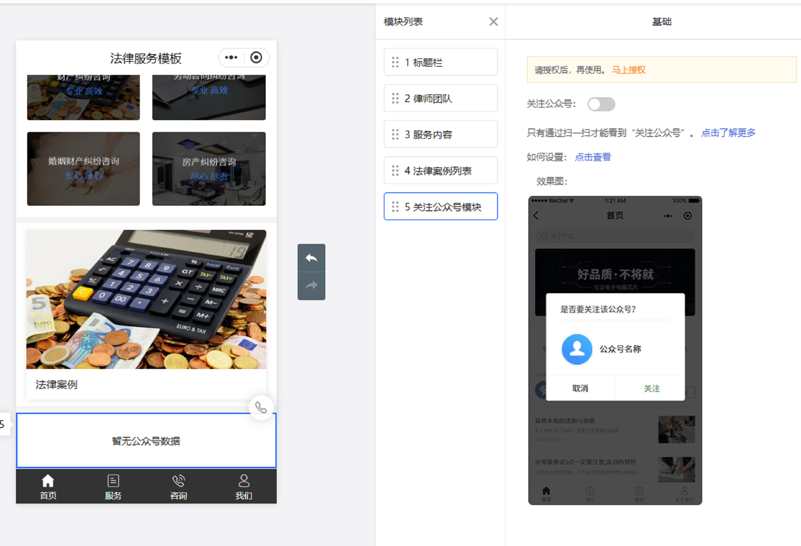 平台上有不同功能的模块可以选择。比方说,你如果有推广自家公司公众号的需求,那么可以添加上“关注公众号”模块,来去引导用户们去关注。