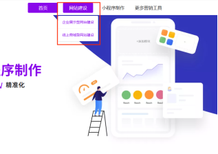 我们点进平台后,将鼠标移动到“网站建设选项上方,就能看到有“企业展示型网站建设”和“线上商城型网站建设”,已经给我们分好了类型,十分贴心和方便~我们可以根据自己的需要,直接点击自己想要的类型,就能一键跳转到模板页面选择模板创建网站啦!
