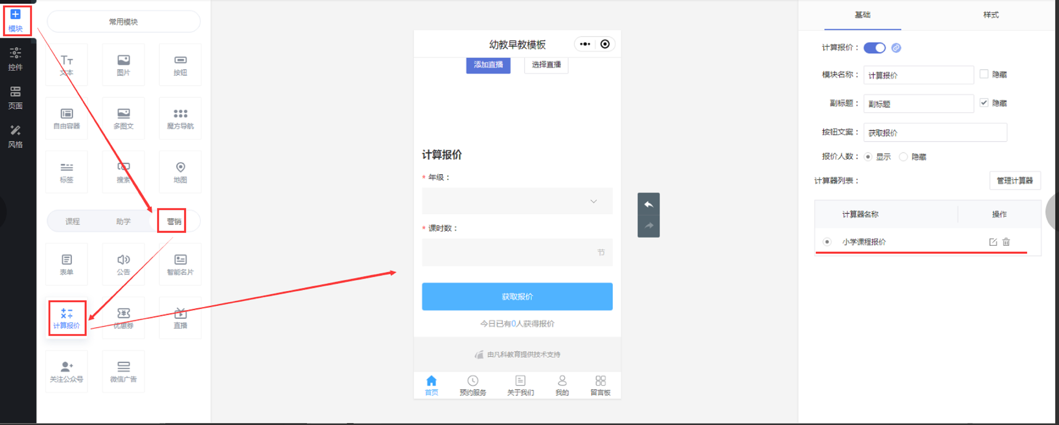 点击“营销”模块,找到“计算报价”进行添加。我们可以选择计算器,编辑模块相关信息,包括模块名称、副标题、按钮文案等。