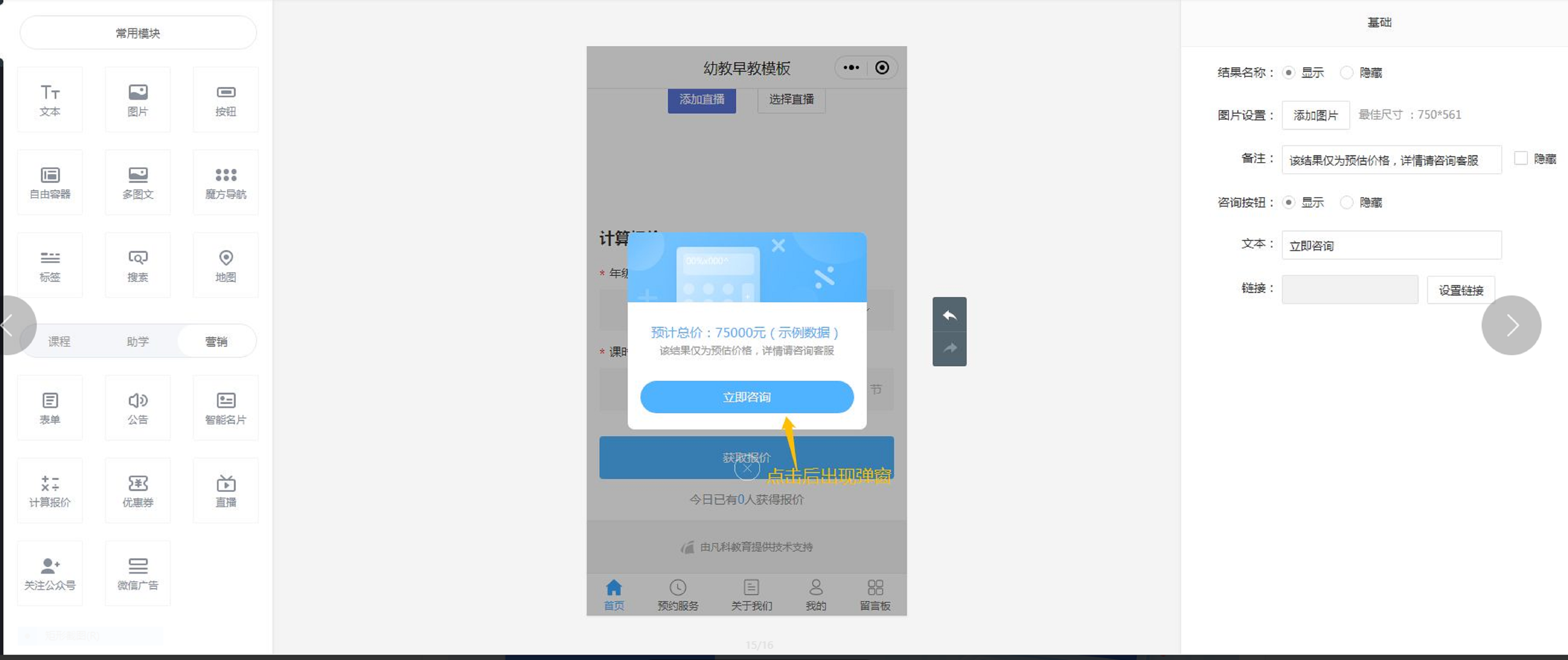 那么,在点击“获取报价”按钮后,展示结果弹窗,大家可以编辑弹窗样式。