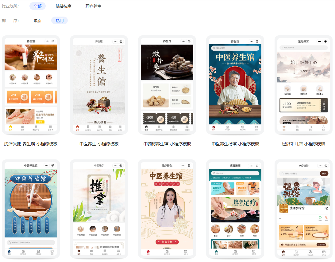 在“所属行业”中选择“洗浴保健”这个类型。在这个类型底下,平台上会出现一些健康养生门店的模板。每一个模板的样式都各有其特点,侧重点都有所不同。