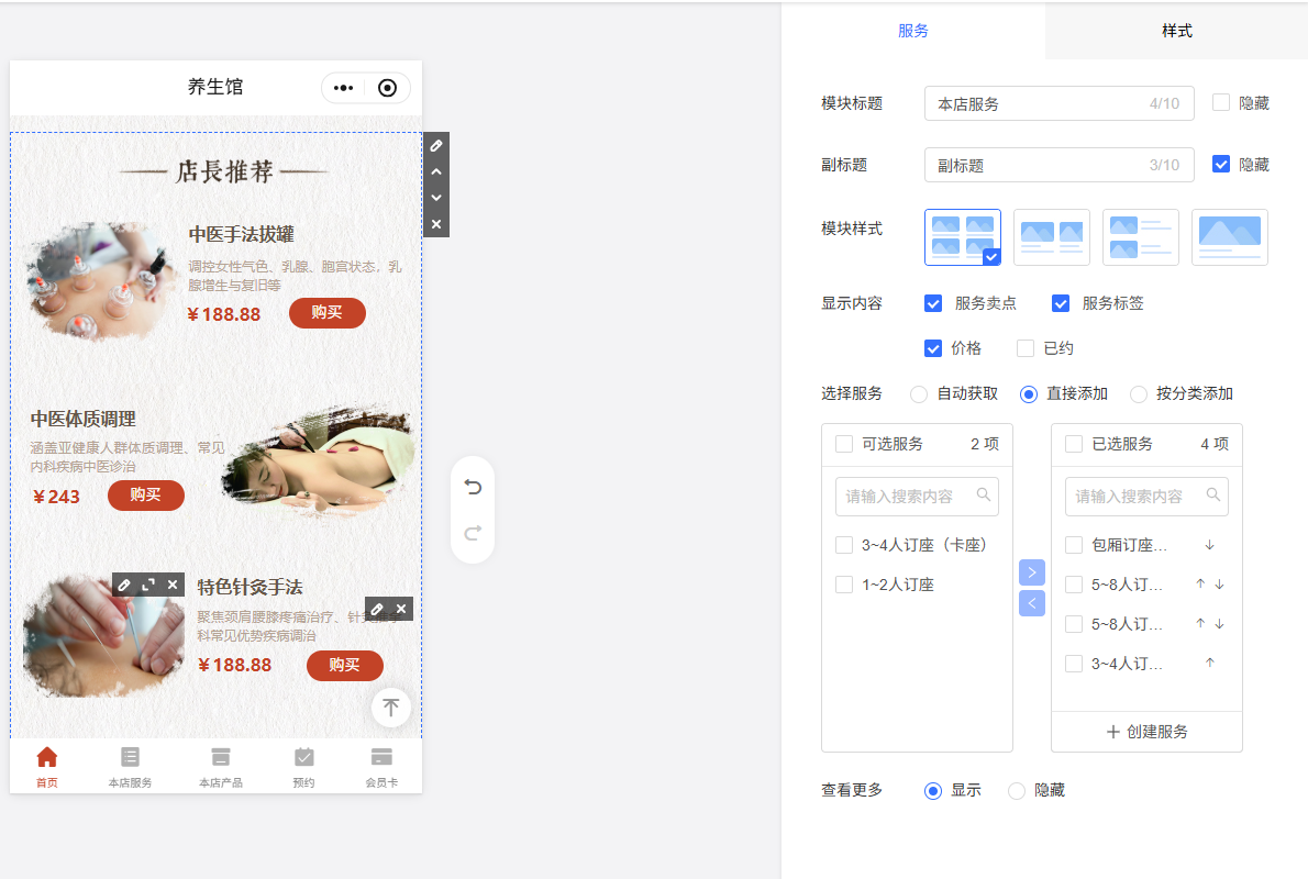 比方说,如果你想更好展示咱们门店可以提供哪些健康服务项目,那添加“服务”模块是个不错的选择。这样顾客可以在线上门店上清晰地看到可服务的项目有哪些啦~