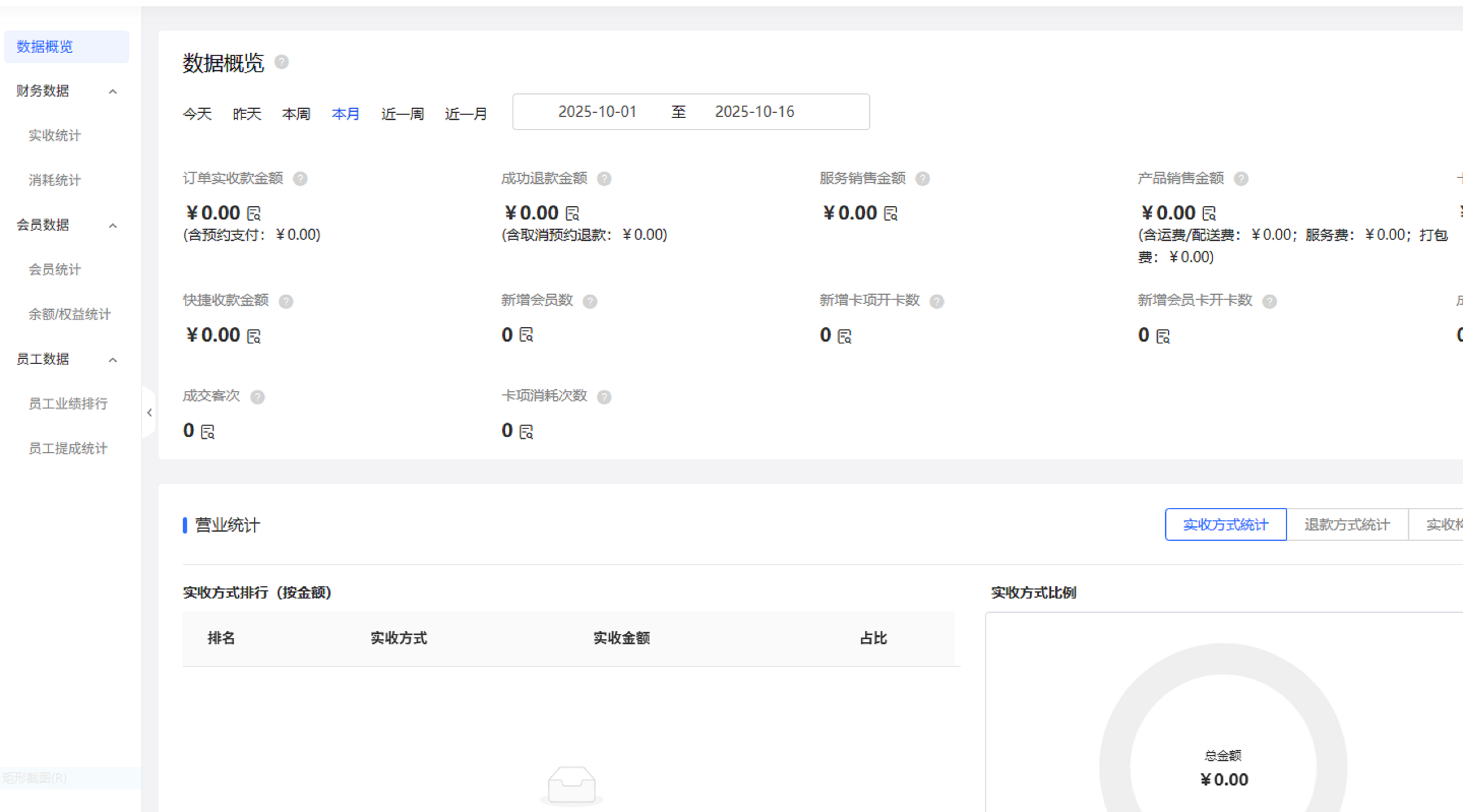 像是在“数据”板块,平台会为大家清晰地统计出财务、员工、会员这三大类的数据信息。当我们想要统计相关数据的时候,门店的服务销售额啊、会员总数啊、员工业绩啊这些都会直观地呈现给我们。