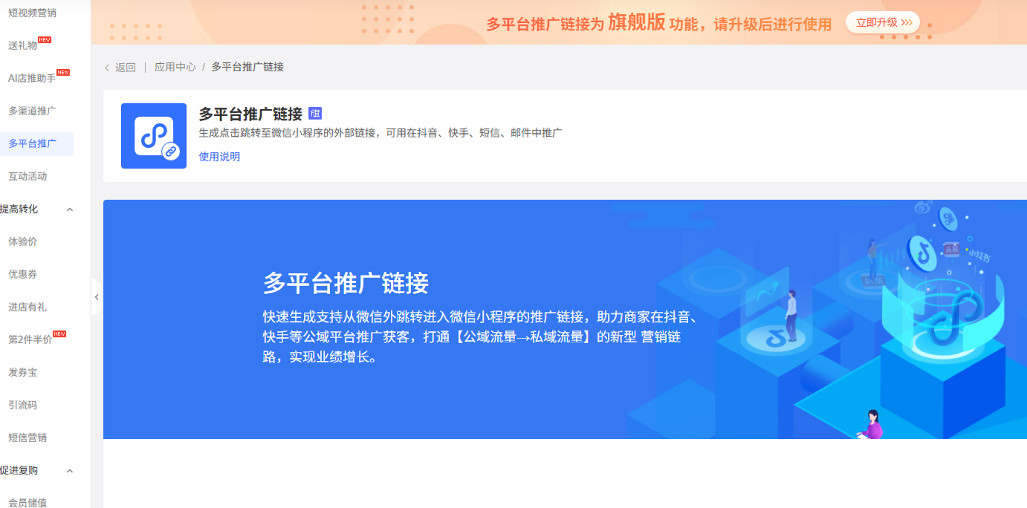 那在“营销”页面,则会有拉新扩客、提高转化、促进复购这三大类功能的营销活动给各位进行选择。所以说,各位不用发愁营销活动想不出来要怎么办啦。