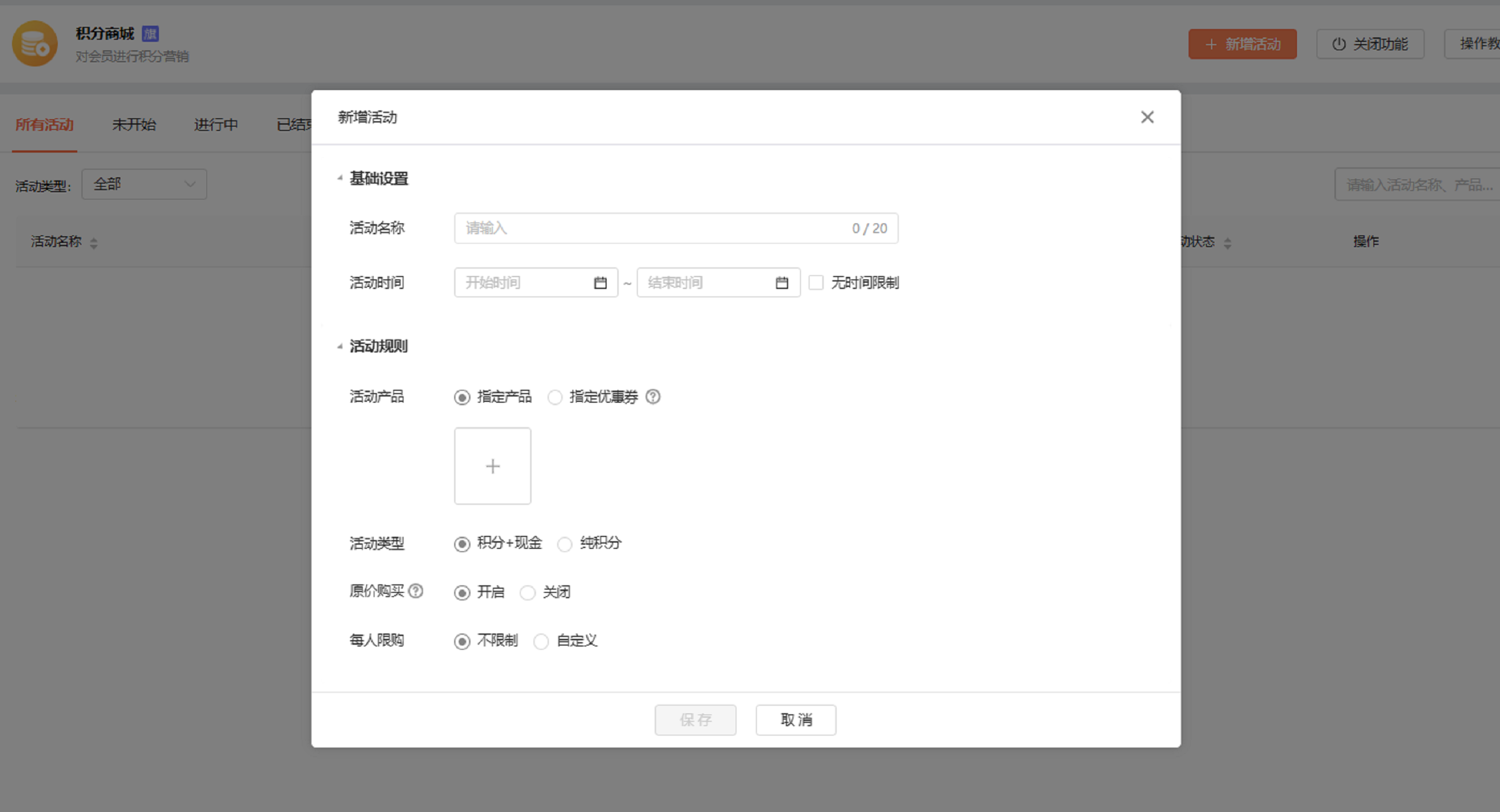 点击“新增活动”后,我们需填写活动名称、时间完成基础设置。