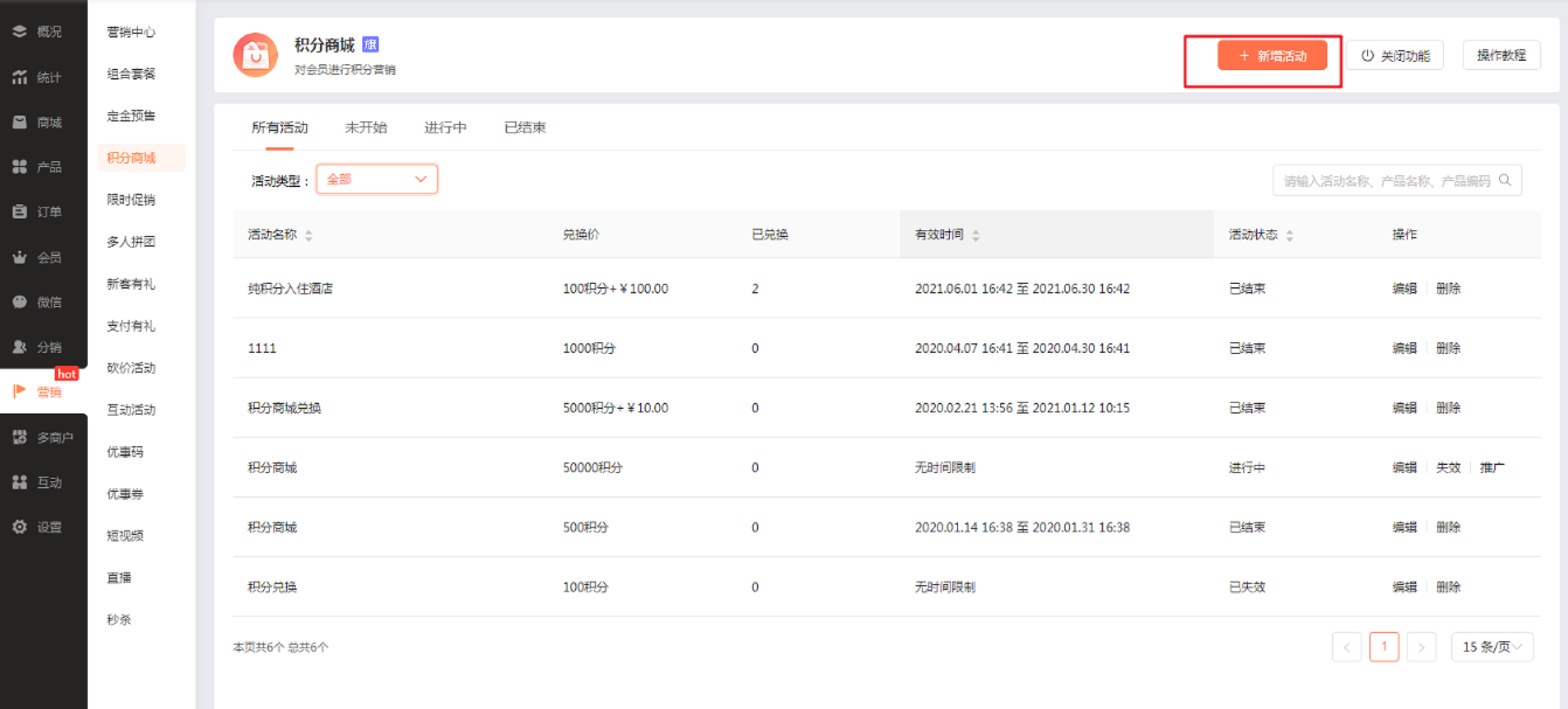 在添加活动完后,平台会呈现出“积分商城”各项活动的明细表。每个活动的兑换价、已兑换的数量、有效期等都会罗列出来。