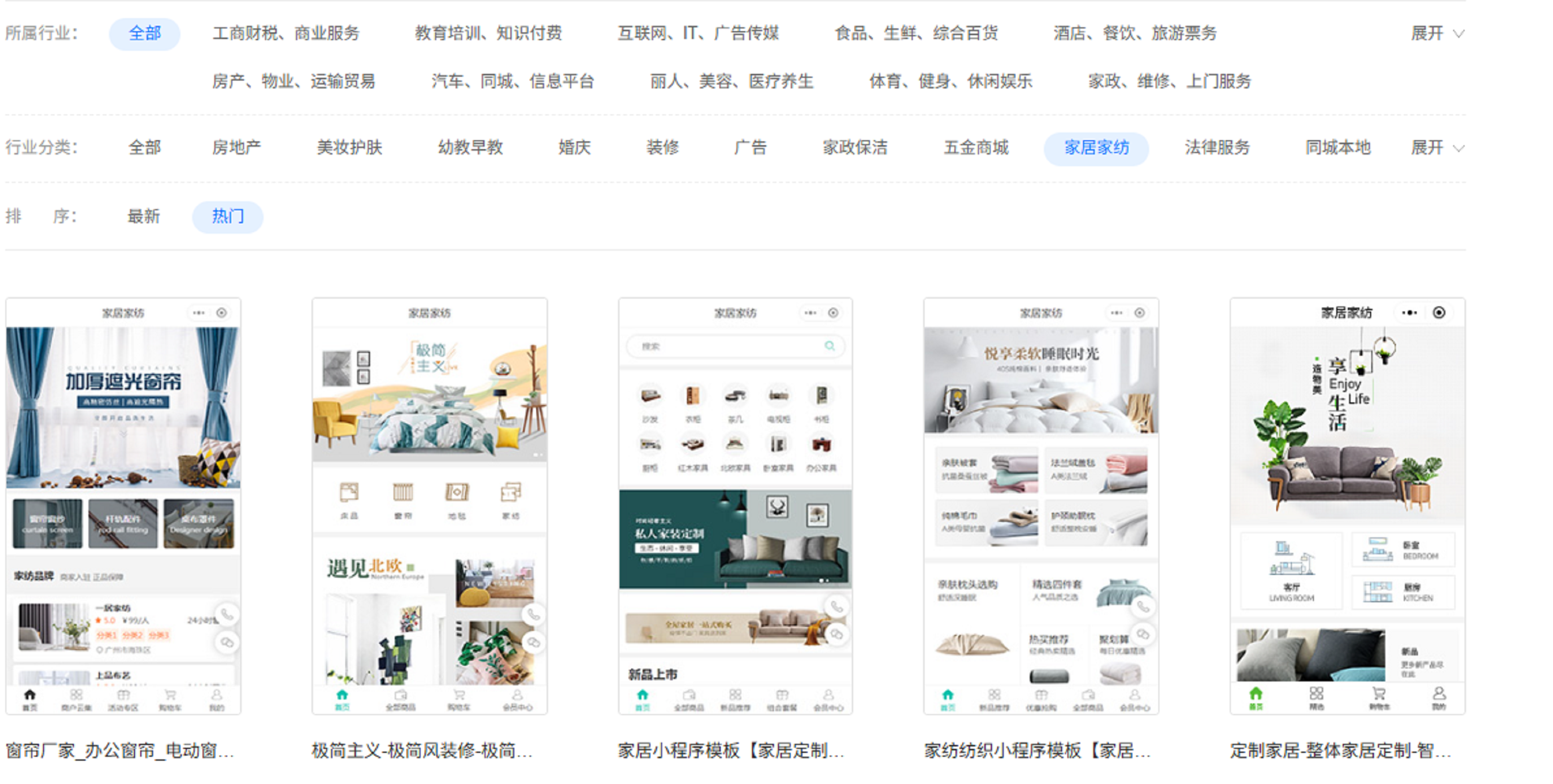 在平台的模板中心,我们在“行业分类”处先来选择自己所属的行业吧。每个行业下面都有着许多精美的小程序模板。