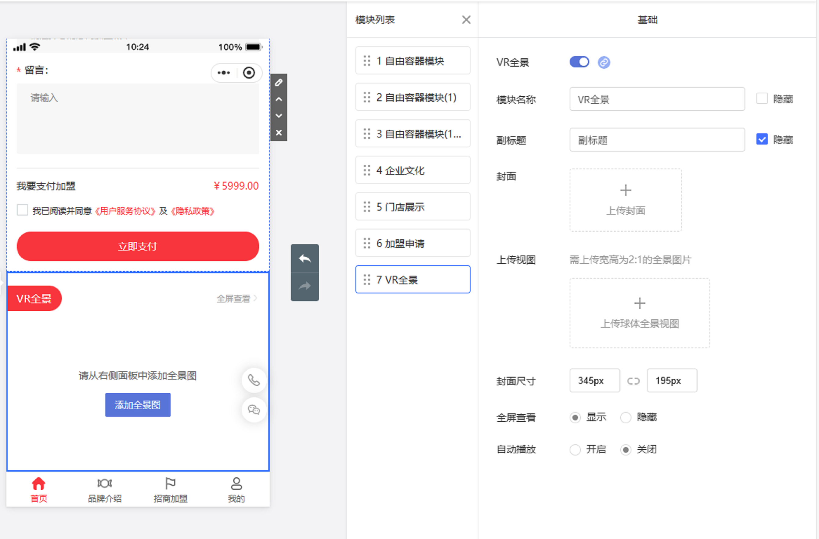 比如说,你想让用户沉浸式地线上参观你家公司,那你就可以添加“VR全景”模块啦!通过上传全景图片,便可以实现用户“云游公司”的需求了。