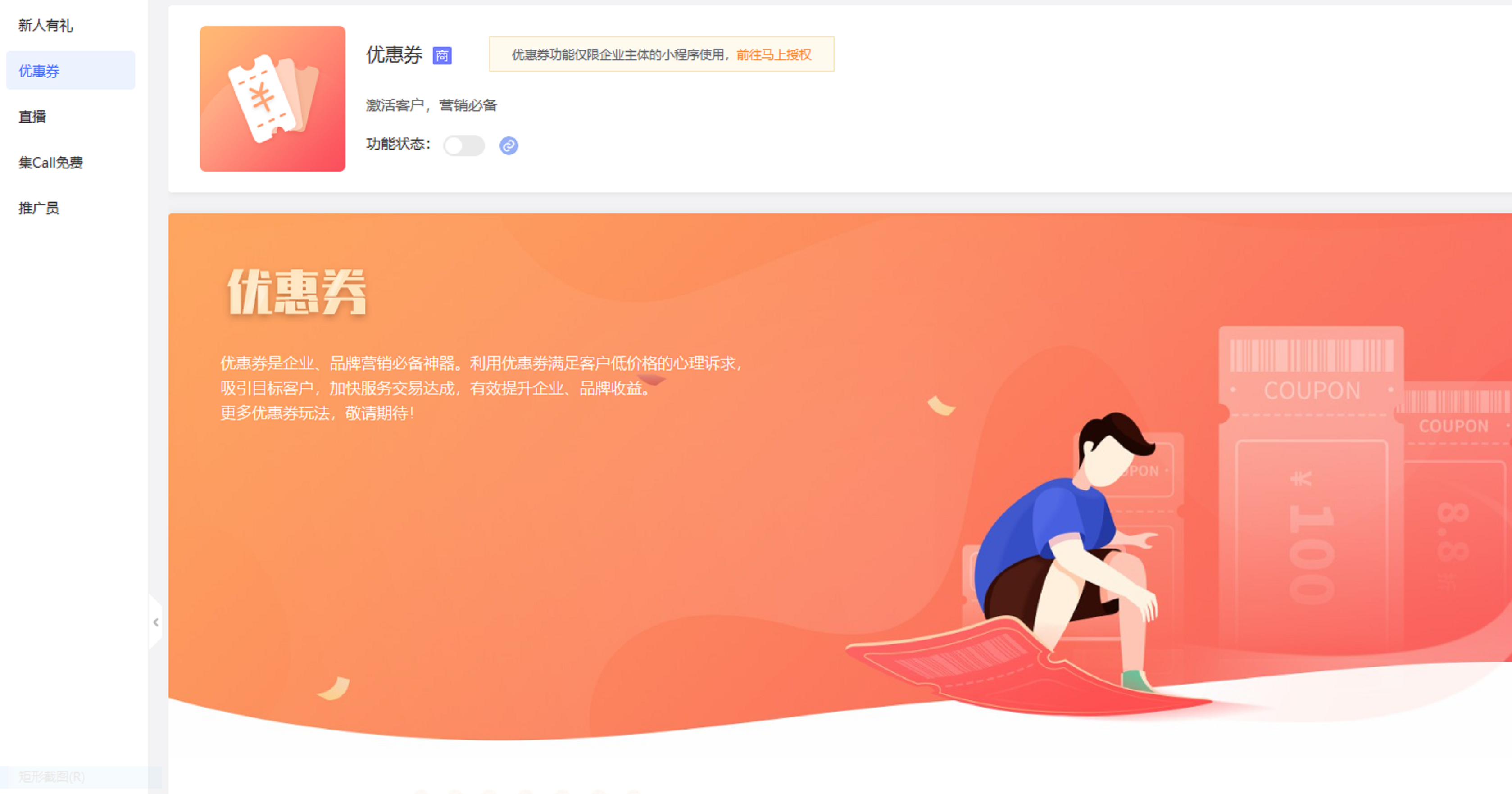 像在“营销”板块,平台提供了新人有礼、直播、优惠劵等营销功能给我们。那咱们就能够按照公司的营销需求来选择对应的活动啦。这样就不用费劲脑袋去想到底要办啥活动呢。