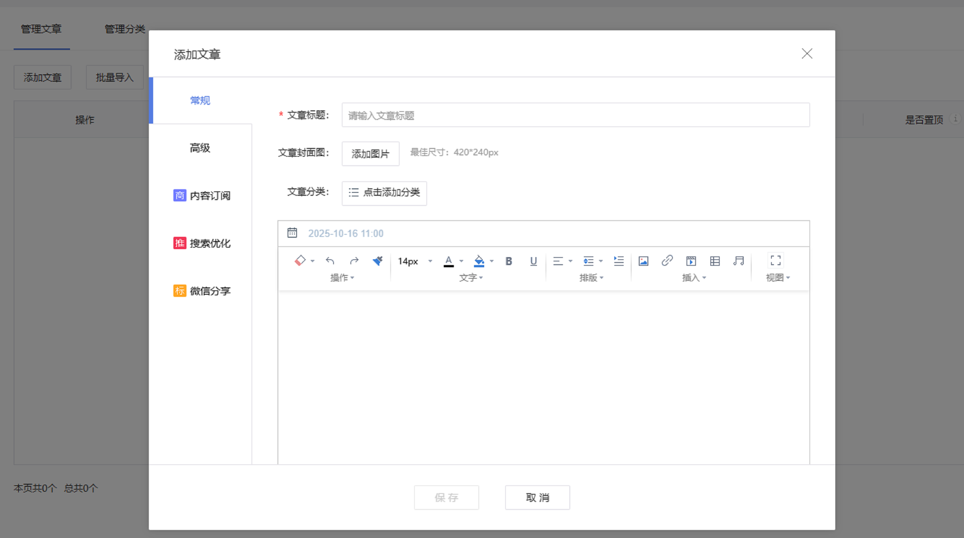 那在“内容”板块,主要是对小程序上的一些文章、视频、音频等内容进行集中添加与管理。你可以批量导入,并且查看实际的订阅量是如何的。