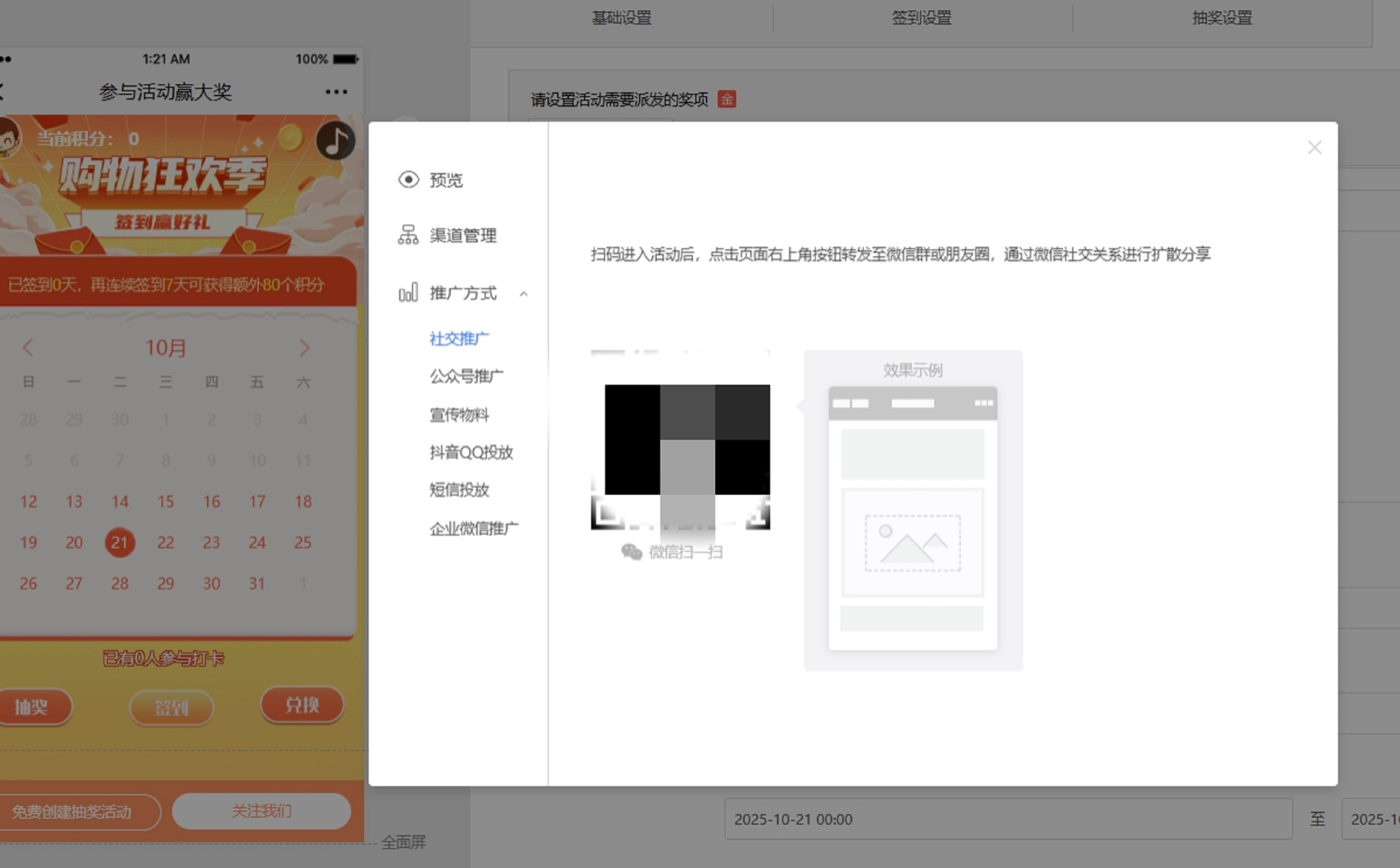 在设置活动这环节,主要是对活动的基础信息、签到、抽奖、礼品这几块内容进行设置。