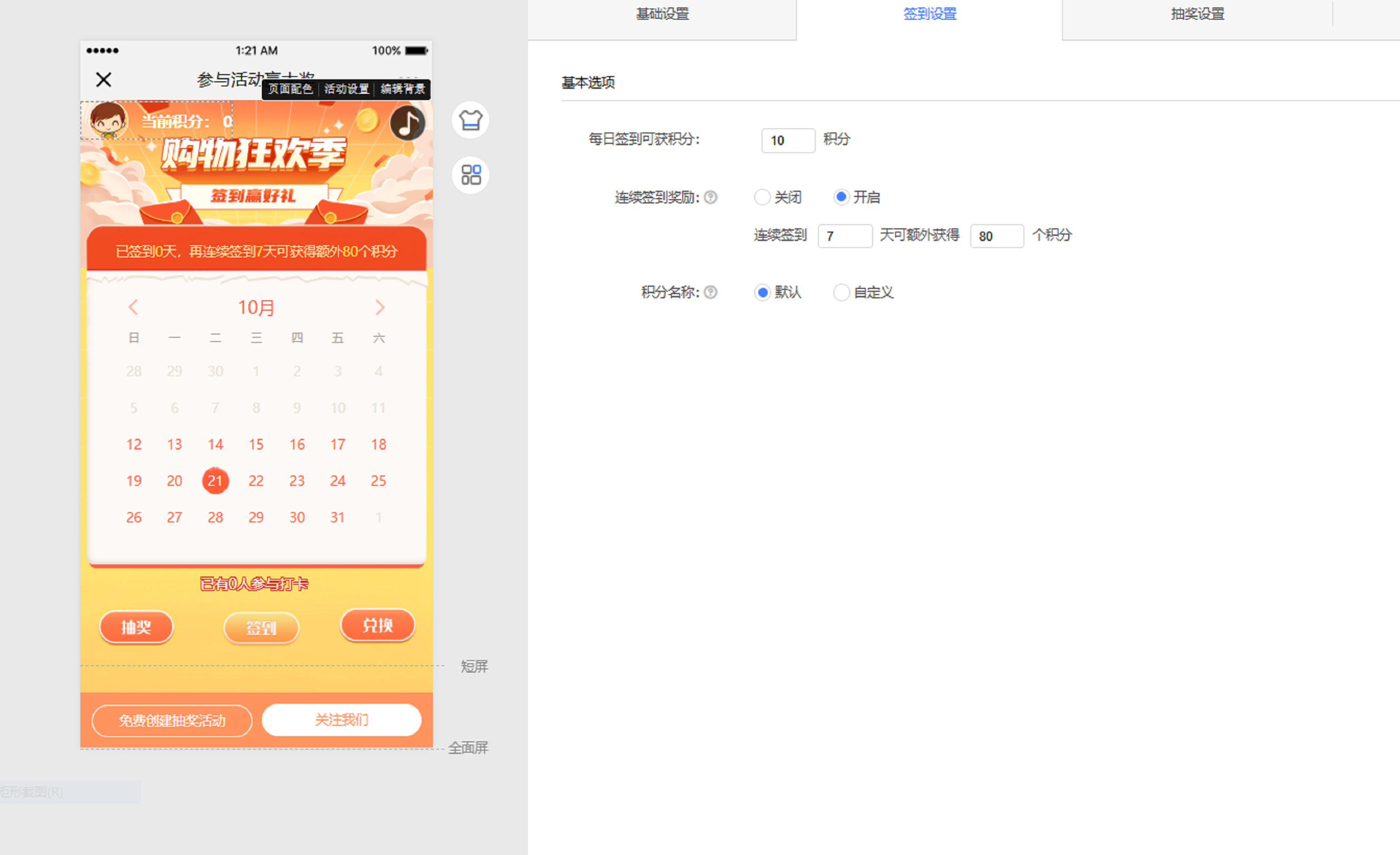 其次,在“签到设置”中,你可以设置每日签到可以获得的积分。以及选择是否开启连续签到奖励。开启后,或许能够更加激励人们积极参与到本次活动中来。
