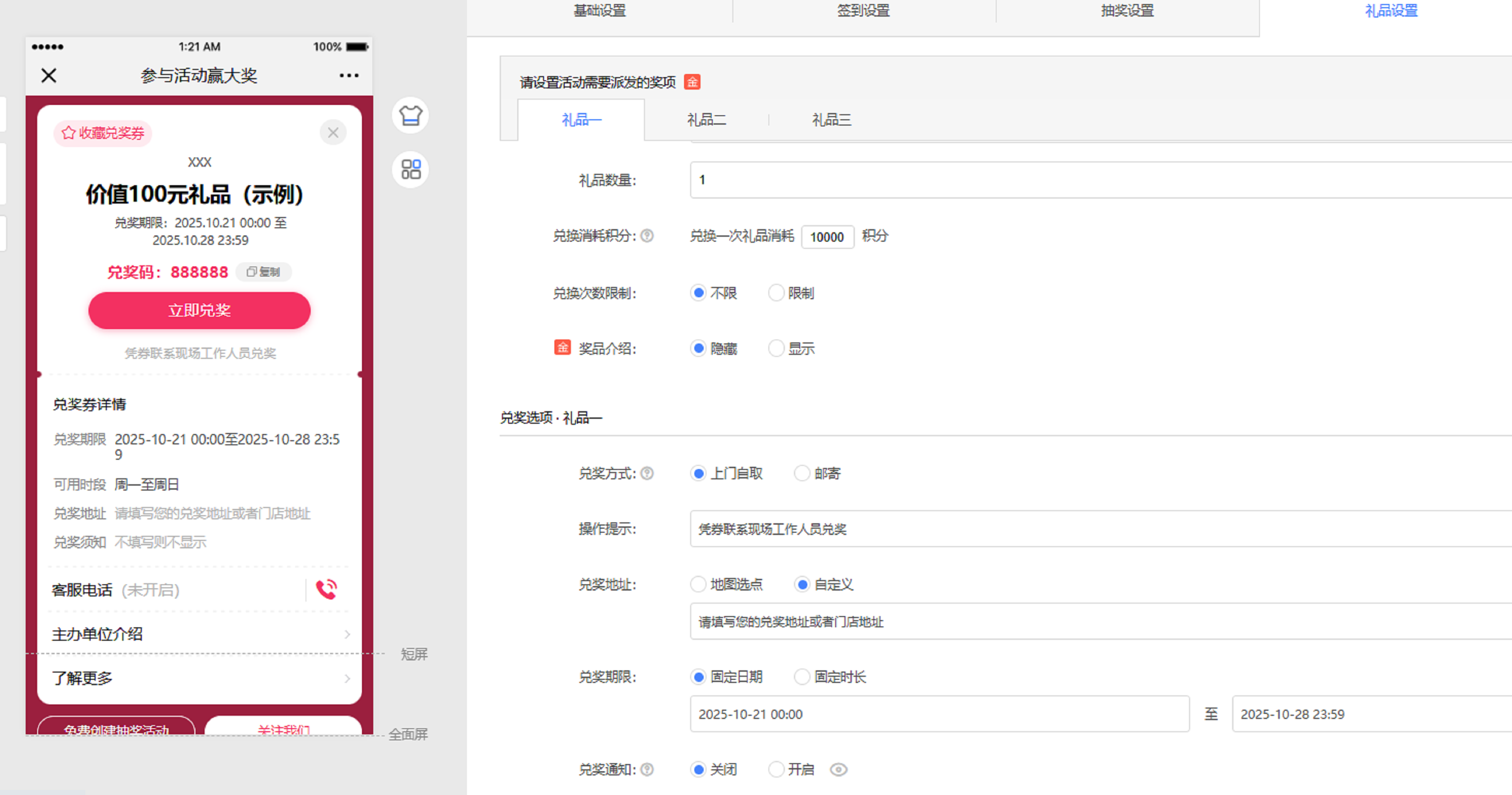 并且,兑奖方式、地址、期限等信息的设置也是在这个页面来完成的哇!