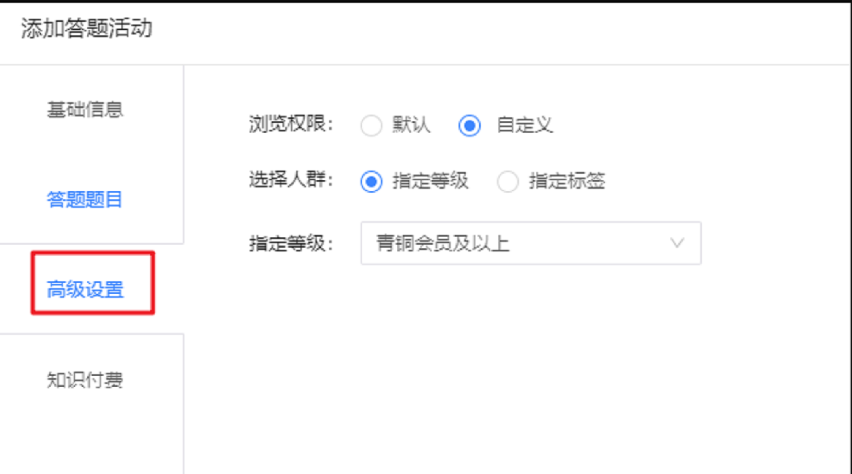 这一步支持我们来设置答题权限。咱们能让指定人群参与答题活动。
