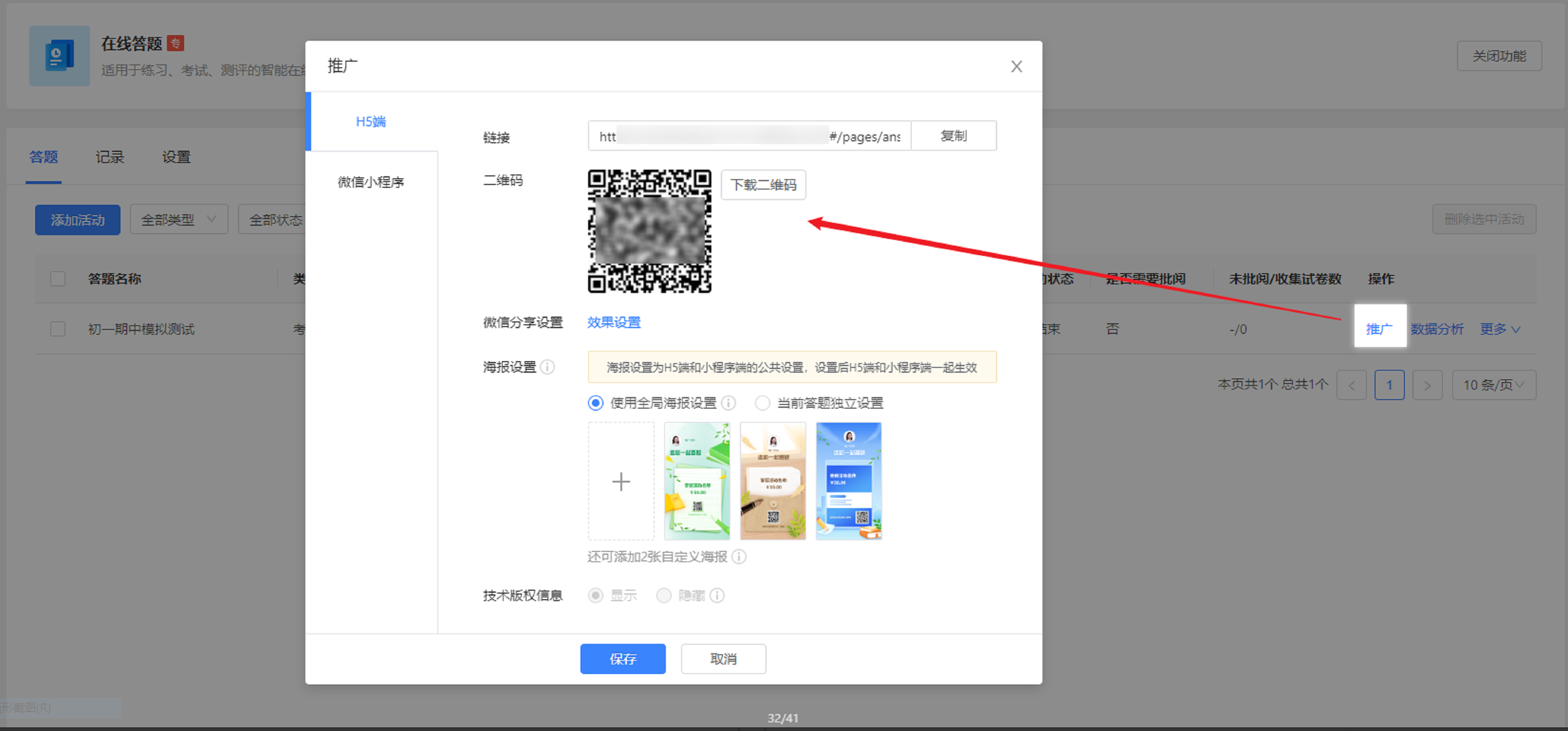 点击答题活动“推广”按钮来获取推广链接/二维码/分享海报进行推广。这样就让更多人可以参与进来啦!