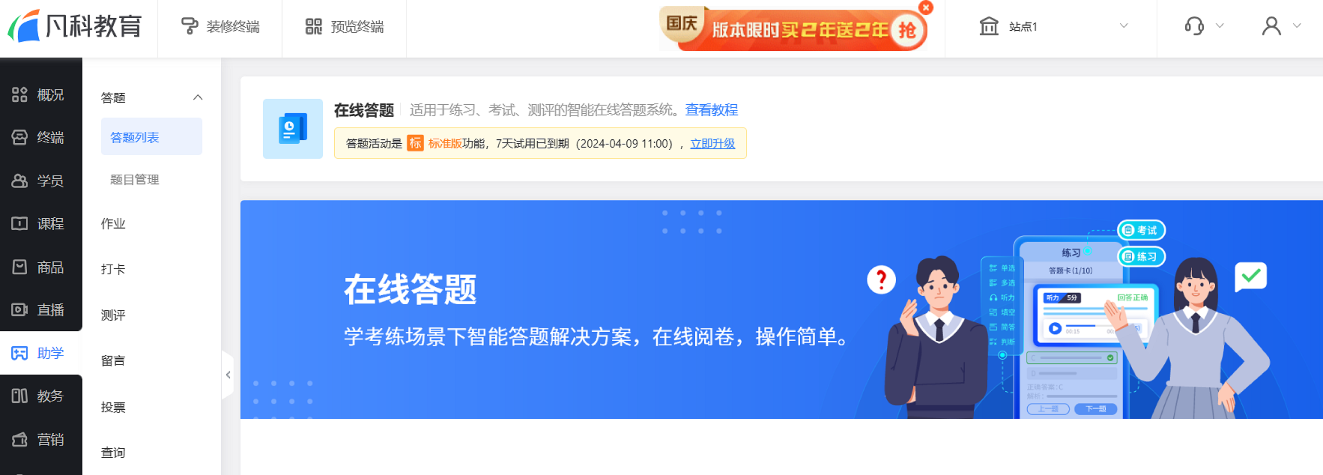 首先,进入管理后台,选择“助学”板块,点击“在线答题”,再开启其功能就可以啦。