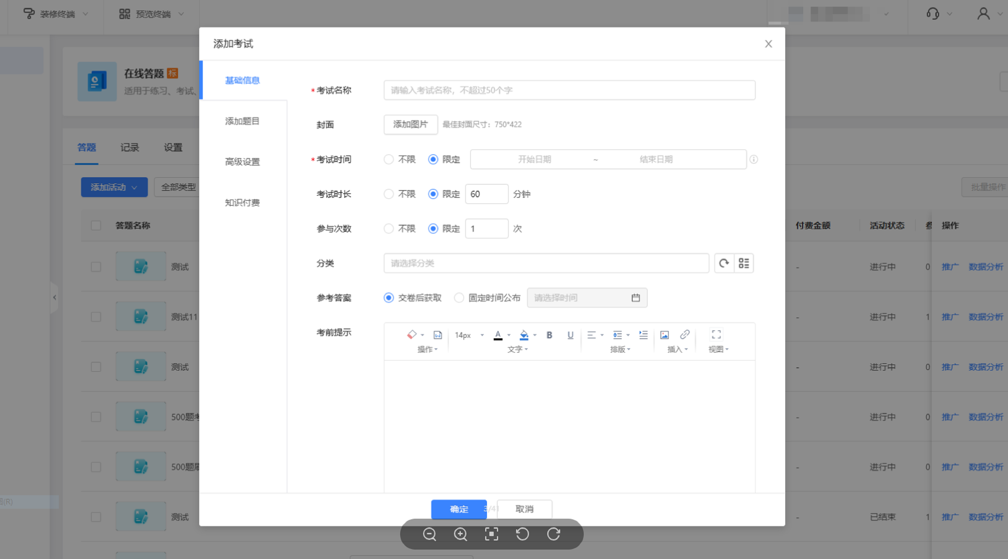我们需要填写好诸如考试名称、考试时间这些基本信息。