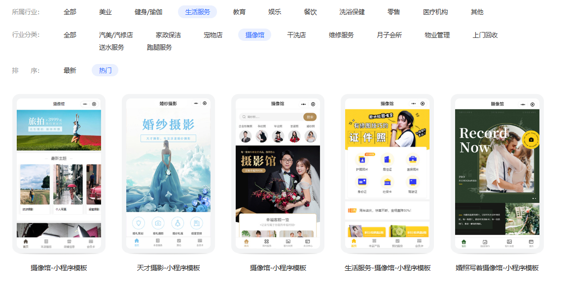 进入模板中心后,我们首先在“所属行业”这边选择“摄像馆”。那么,大家会看到平台为各位提供了几款风格与样式不同的线上摄影馆。