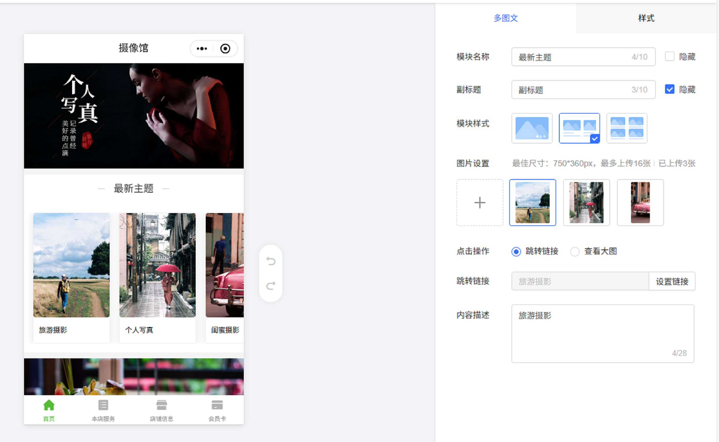 所以,如果你对原本模板自带的“多图文”模块不满意的话,可以直接点击它。对其的模块样式,图片设置进行更改。同时也能够加上相应的文字描述内容,让大家可以更清楚具体的拍摄项目。