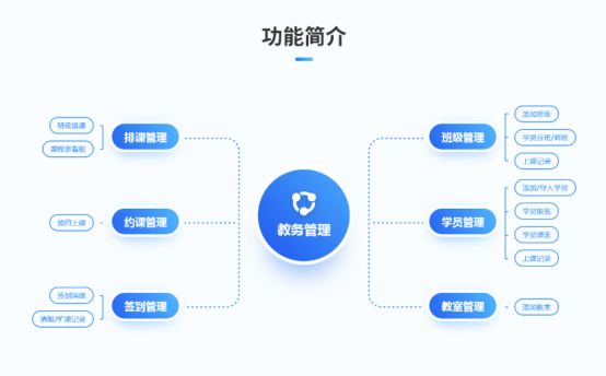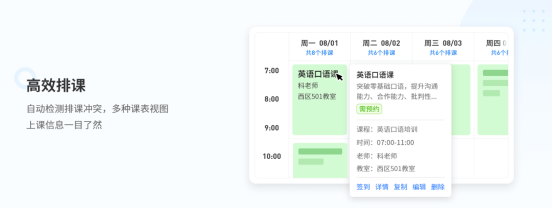 因为是专门面向教育行业者制作的平台,所以它这有不少专业的功能。除了我们想了解的排课管理之外,像平时课堂开始前的签到啊,或者是班级的管理,例如说创建班级、学员调班、上课记录什么的,它都一应俱全,用着像打开了百宝箱似的,学员管理、约课管理等全部都包含在里面,别提多方便了!