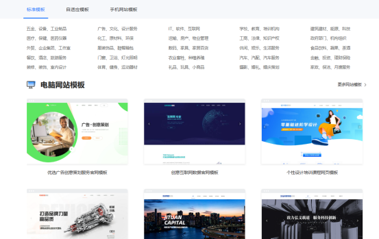 首先,我们打开平台,点击“网站建设”,然后就进入到了模板选择界面。这里有各种行业的模板,无论你是想做一个和什么行业有关的网站,这里都能够满足你的需求!同时,这里的网站模板还分为电脑模板、手机模板和自适应模板,如果你想要网站在手机和电脑上都可以无障碍打开,记得不要挑选错误哦!