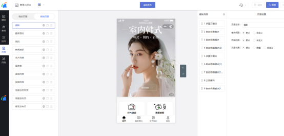 点击应用模板后,我们就进入修改界面啦。我们可以在左侧那里找到“页面”,然后点击“系统页面”,了解一下具体功能有哪些,因为我们要做的是旅拍方面的小程序,所以摄影作品展示和服务预约这两个板块可不能少,除此之外,还可以添加一下“我的”以及“留言板”,让顾客更了解店铺以及过往顾客的留言反馈,更愿意选择我们的产品~
