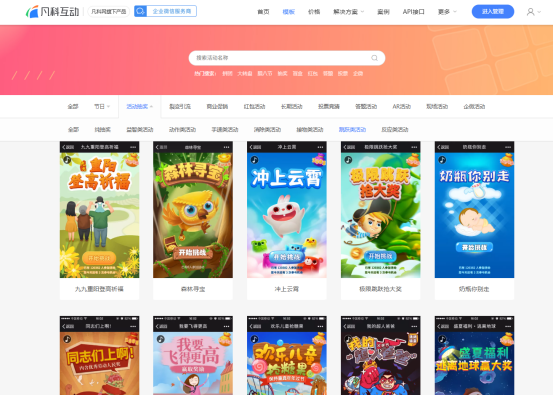 我们进入平台之后,要点击跳转到“模板”页面,这里涵盖了各种各样的互动游戏,不过跳跃类游戏藏得有点隐秘,我们需要把鼠标悬停在“活动抽奖”那里,才能发现“跳跃类活动”的选项。