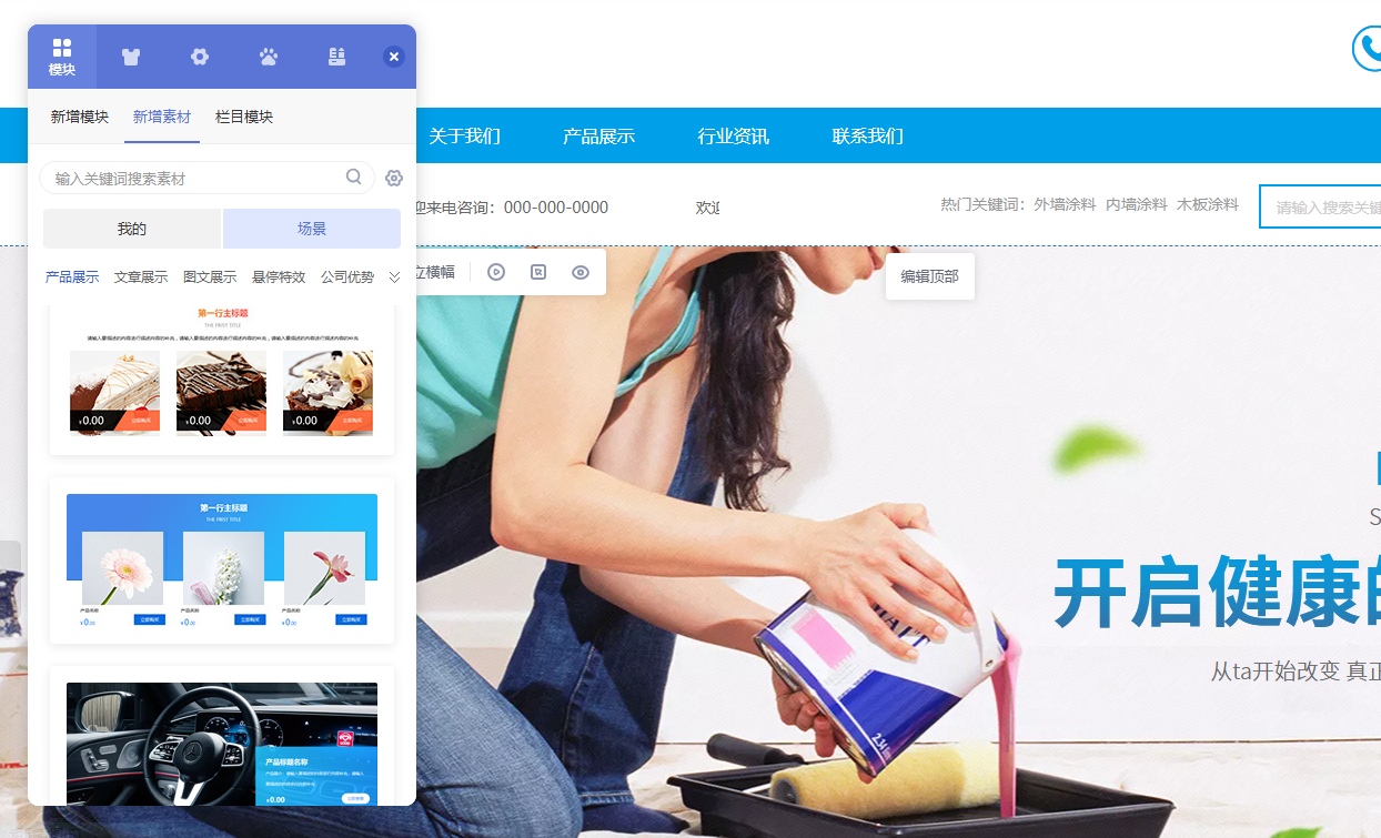 如果你对于网站的排版没有啥思路,平台也为大家提供了一些现成的素材。点击“模块”中的“新增素材”,我们便能看到各个不同配色、风格以及适用于不同场景的设计素材喽!